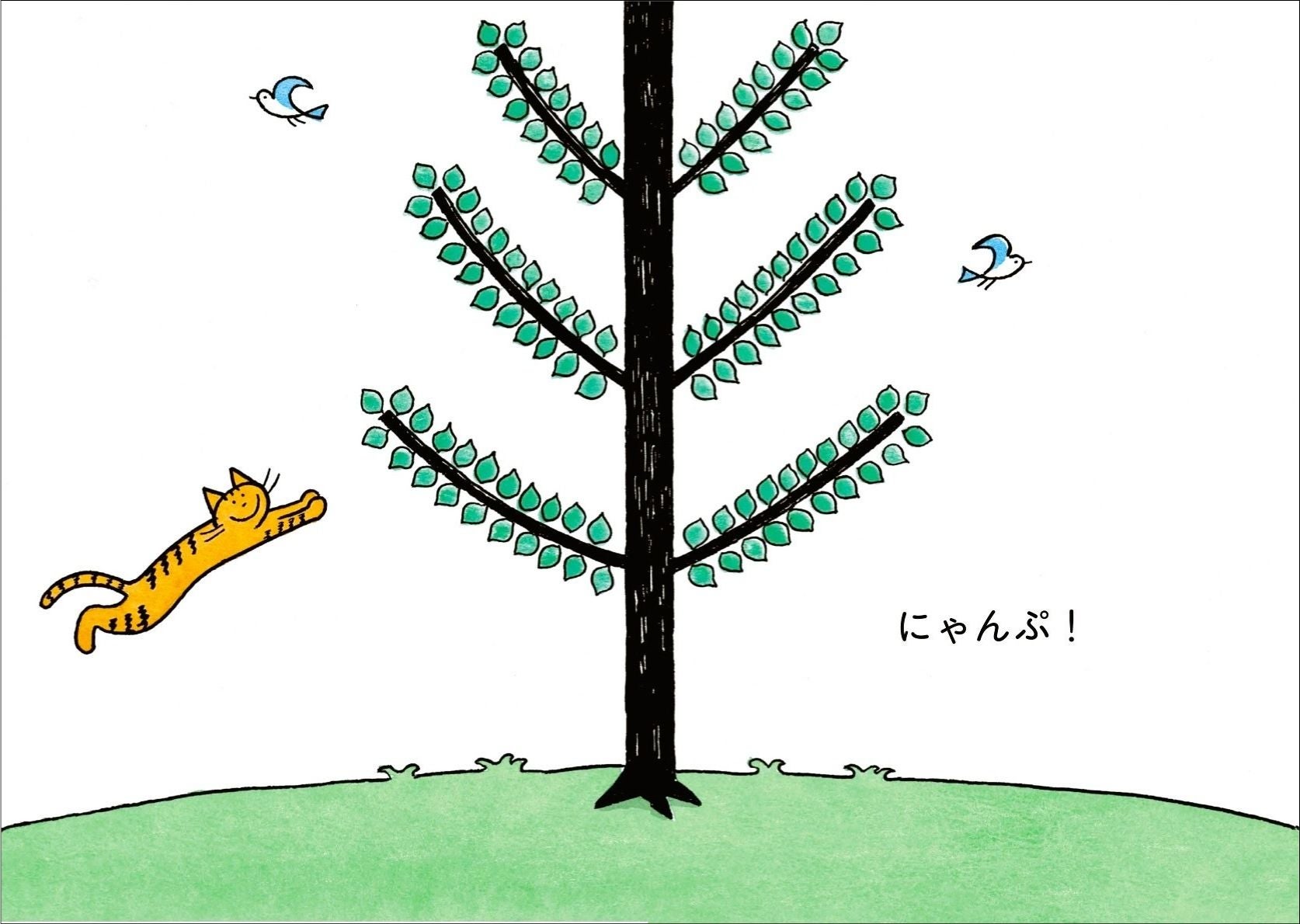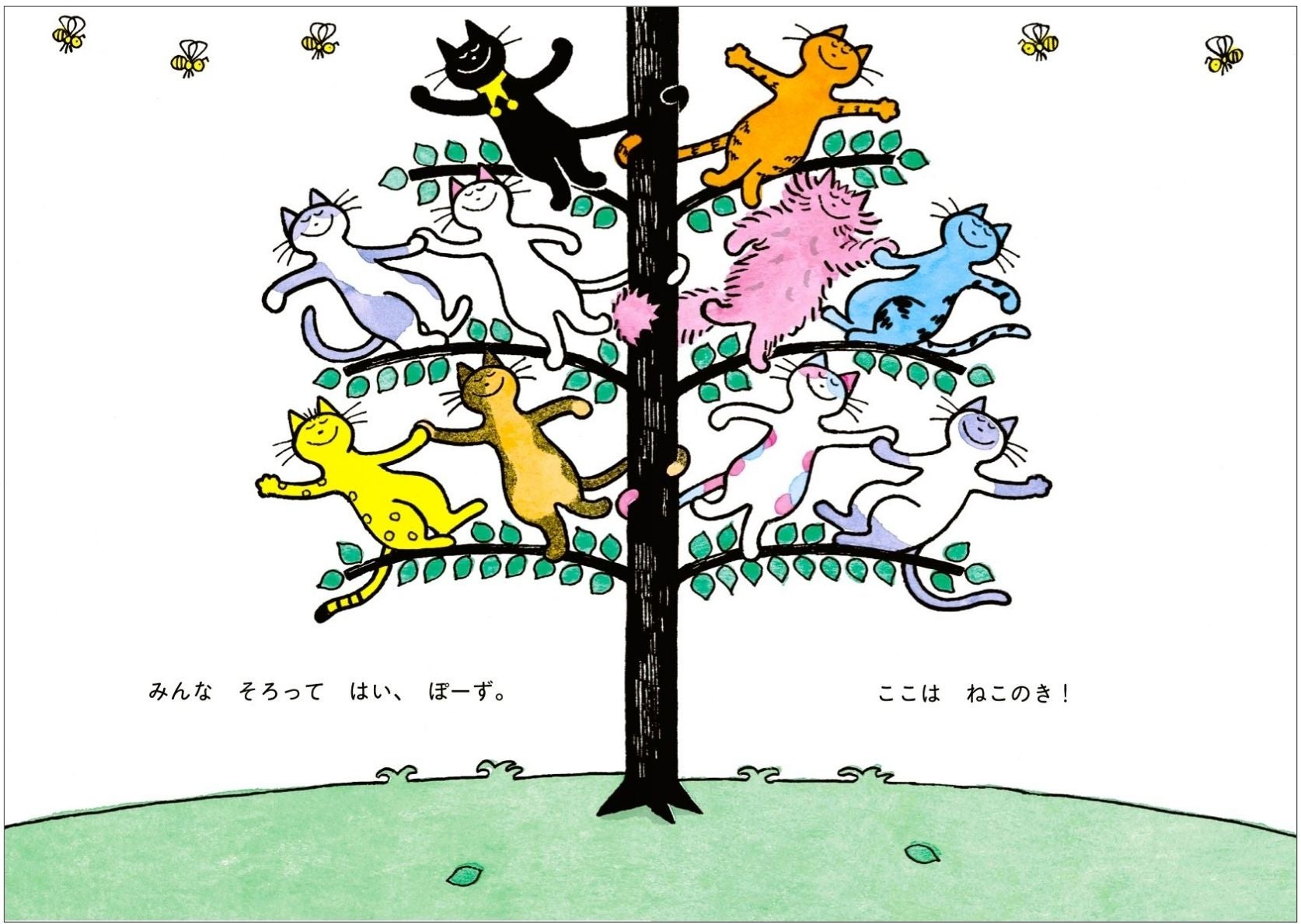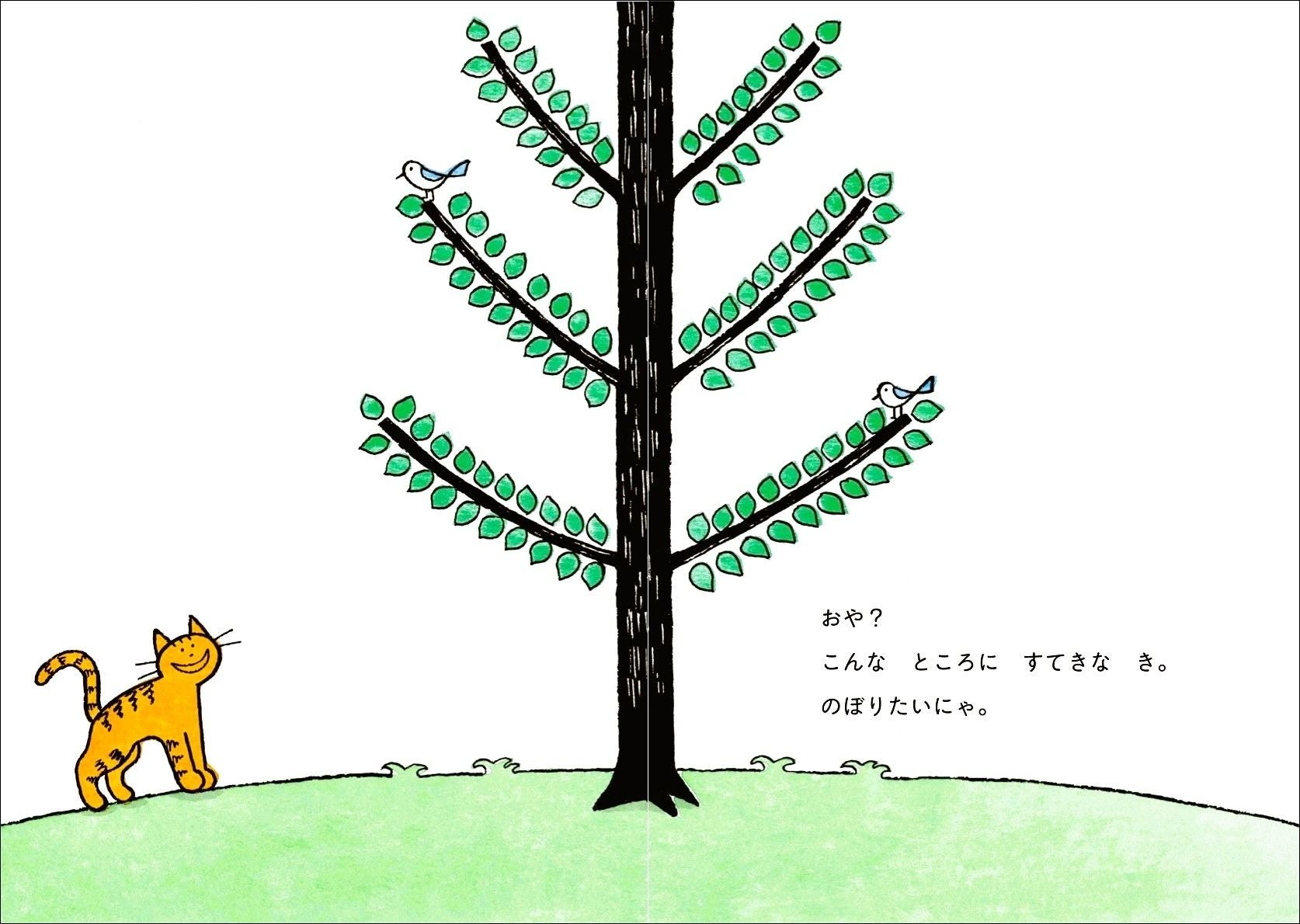 愛らしい10匹のねこたちがみつけた1本のすてきな木。「のぼりたいにゃ!」「にゃんぷ! にゃんぷ!」と、ねこたちは次々に木に登り始めます。
