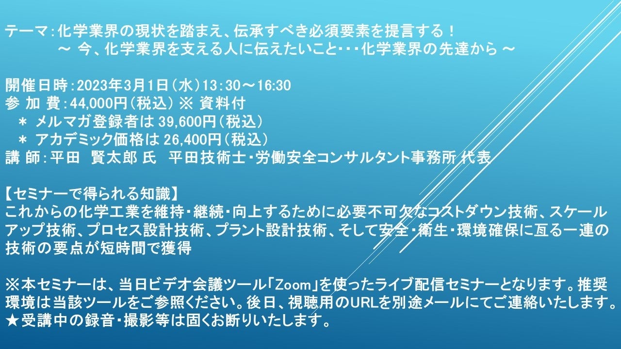先端技術情報や市場情報を提供している(株)シーエムシー・リサーチ(千代田区神田錦町: https://cmcre.com/ )では、 各種材料・化学品などの市場動向・技術動向のセミナーや書籍発行を行っておりますが、 このたび「化学業界の現状を踏まえ、伝承すべき必須要素を提言する!~ 今、化学業界を支える人に伝えたいこと・・・化学業界の先達から ~」と題するセミナーを、 講師に平田 賢太郎 氏 平田技術士・労働安全コンサルタント事務所 代表)をお迎えし、2023年3月1日(水)13:30より、 ZOOMを利用したライブ配信で開催いたします。 受講料は、 一般:44,000円、 弊社メルマガ会員:39,600円、 アカデミック価格は26,400円となっております(資料付)。