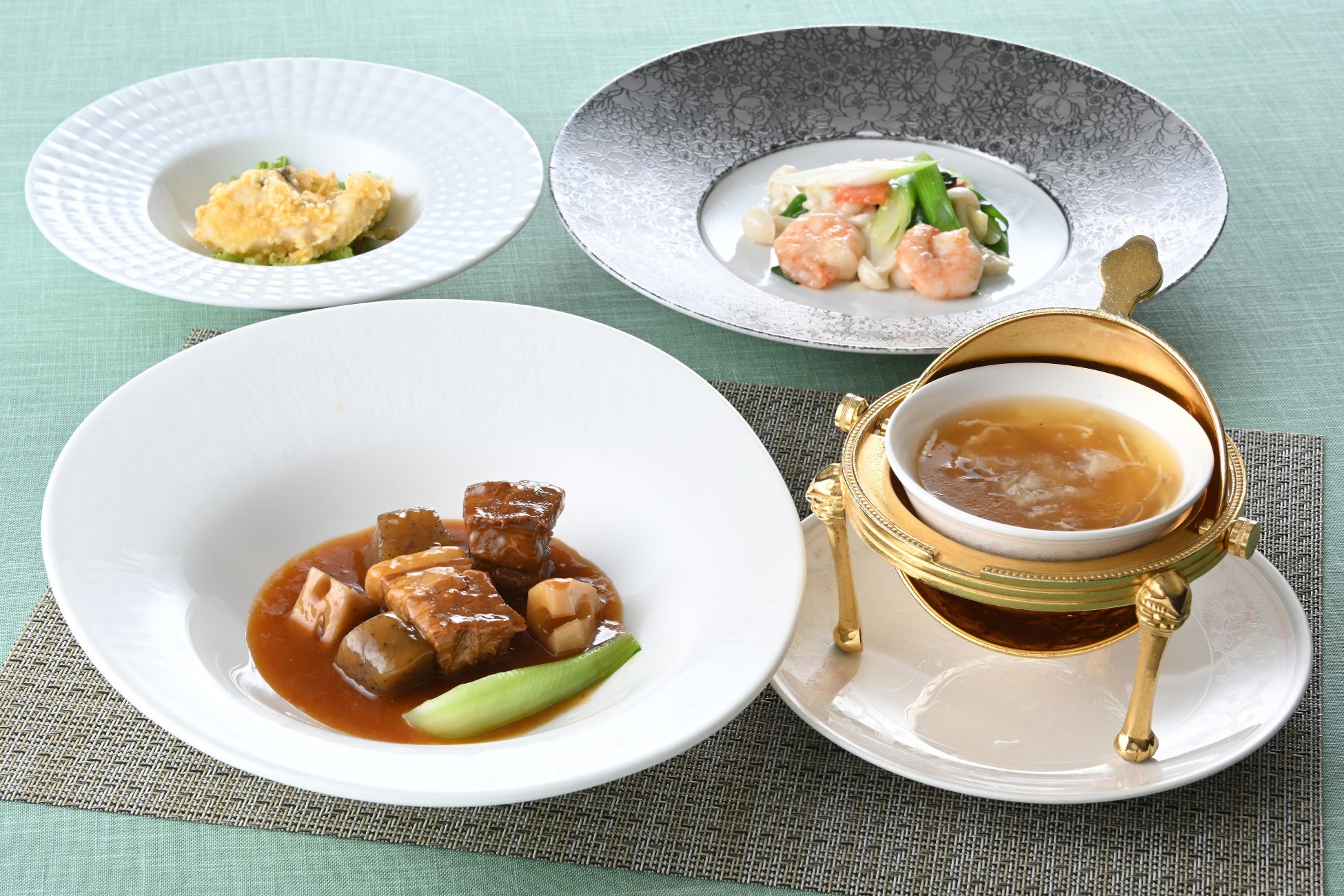 『OK!!広島×リュウコース』では、瀬戸内の温暖な気候で育つ白菜の甘味が、フカヒレと毛ガニの旨味を包み込む“フカヒレ背びれと毛ガニのあっさり煮込み 広島県産白菜と”や、メインには、やわらかな舌触りに上品な脂肪の香りが溶け合う広島血統和牛「元就」を、3つの県産素材のソースで味わう“元就牛ロース肉の中華ステーキ3種のソース”など、全7品をご用意しました。