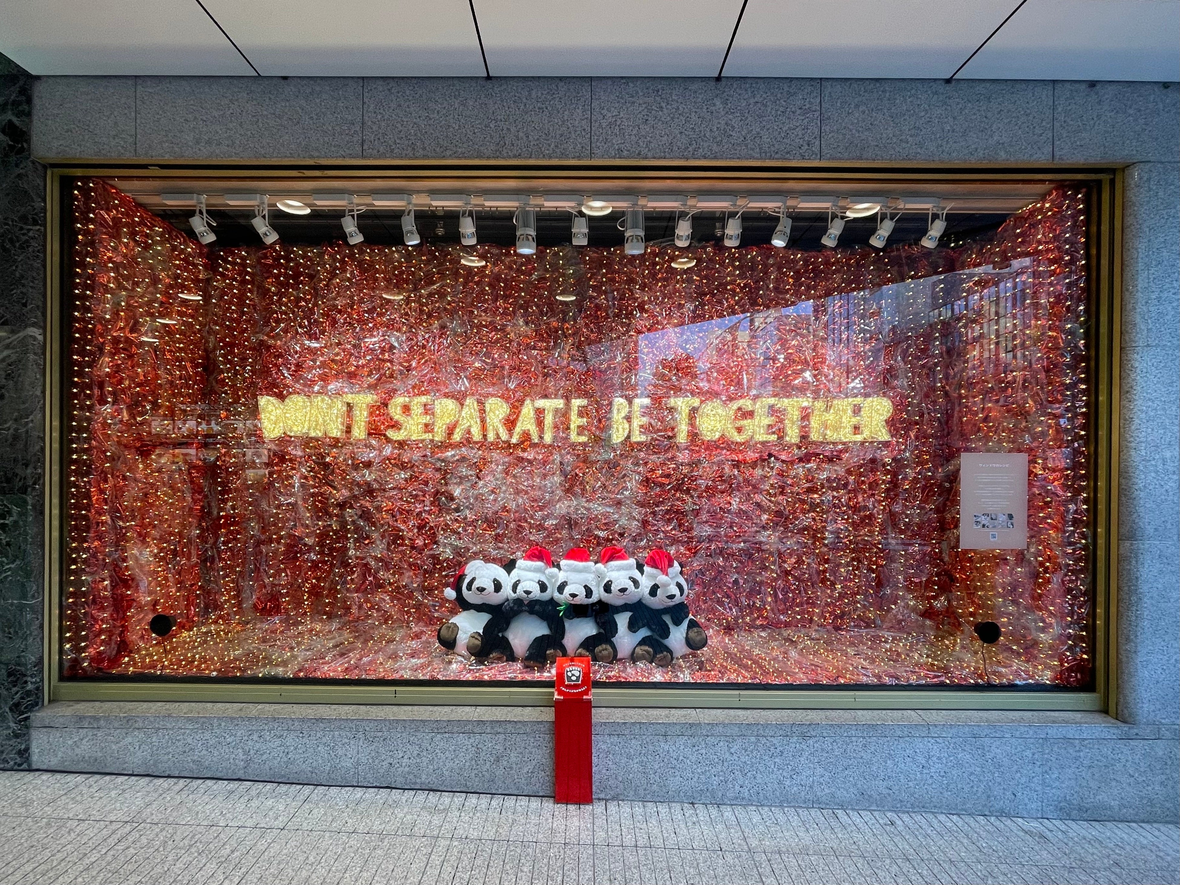 コロナ禍の象徴であった廃棄予定の「飛沫防止シート」や「アクリル板」を、ウィンドウをはじめとする店頭の装飾にアップサイクルしました。 「一緒にいよう、共に楽しもう」というメッセージとともに持続可能で平和な社会への願いも込めています。