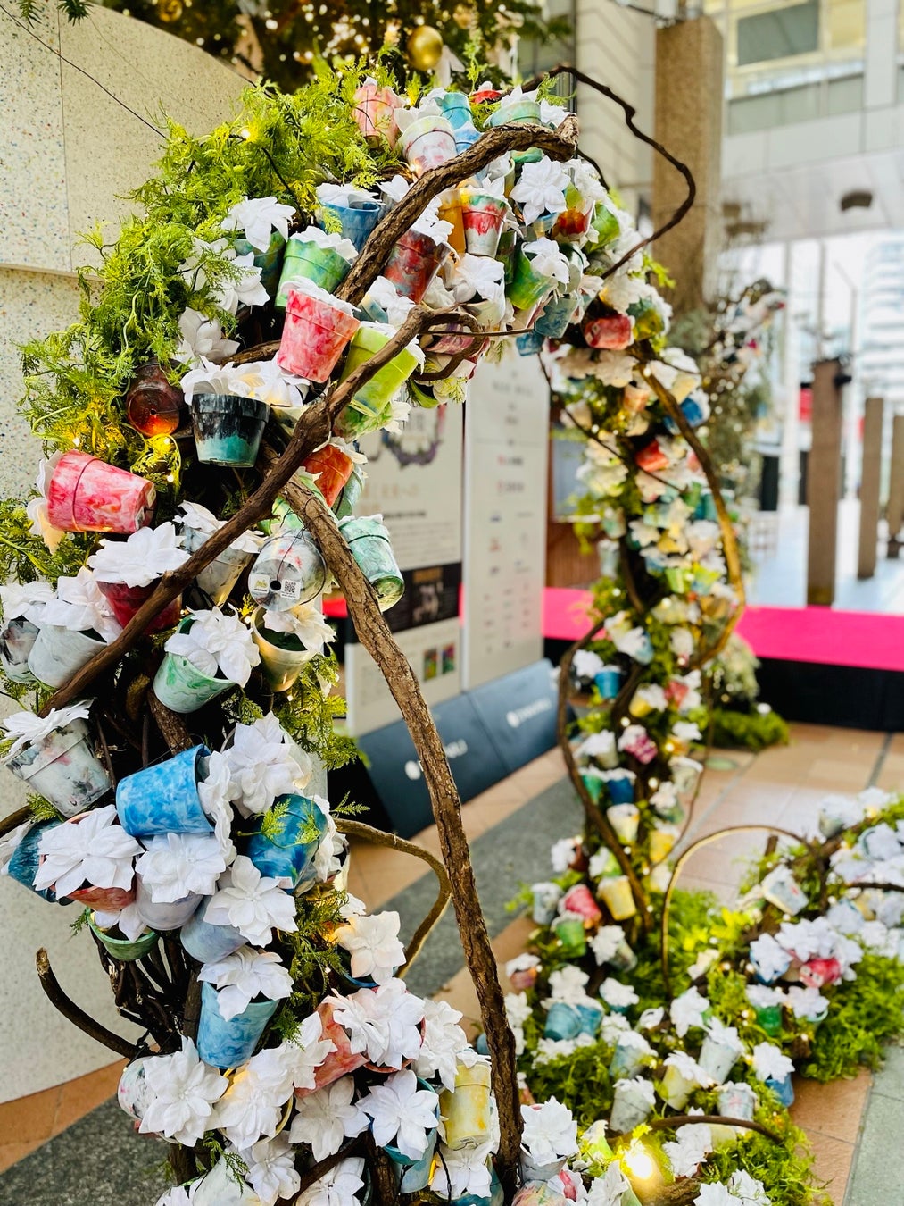 博多大丸は、廃棄・海洋プラスチックのアップサイクルに取組むことで、資源の循環とより多くのコミュニケーションを生み出す活動を行っています。本年は「循環」のアイコンとして、廃プラや海洋プラごみを使用した“フラワーポット”を製作し、フォトスポットの装飾に使用しました。イベントや、手にした人々の周りで新たなコミュニケーションが生まれ、廃棄されるはずものが価値のあるものに生まれ変わること、また資源を有効に活用することを体感できる活動を目指しています。