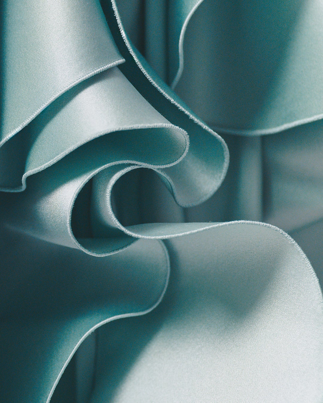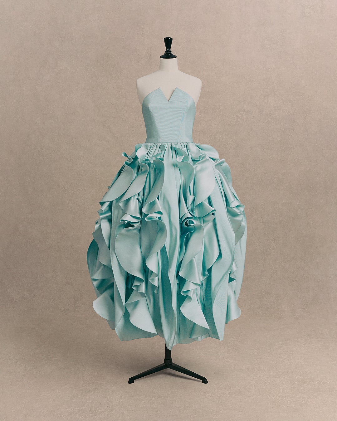 ライトブルーのVネックビスチェドレスは、柔らかなバルーンシルエットと、全体に施した不規則なフリルが特徴です。ラッフルはスカートの前後にかけて幾何学的に繰り返され、洗練された立体感を演出します。このドレスは、約300時間以上の時間をかけ、制作されました。