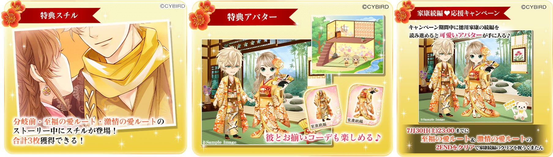 ③配信を記念して「家康続編♡応援キャンペーン」を2022年7月30日(土)23時まで開催します。期日までに「至福の愛ルート」「激情の愛ルート」の両方をクリアすると、アバターアイテム「家康続編のクリアを祝うくまたん」をプレゼントします。