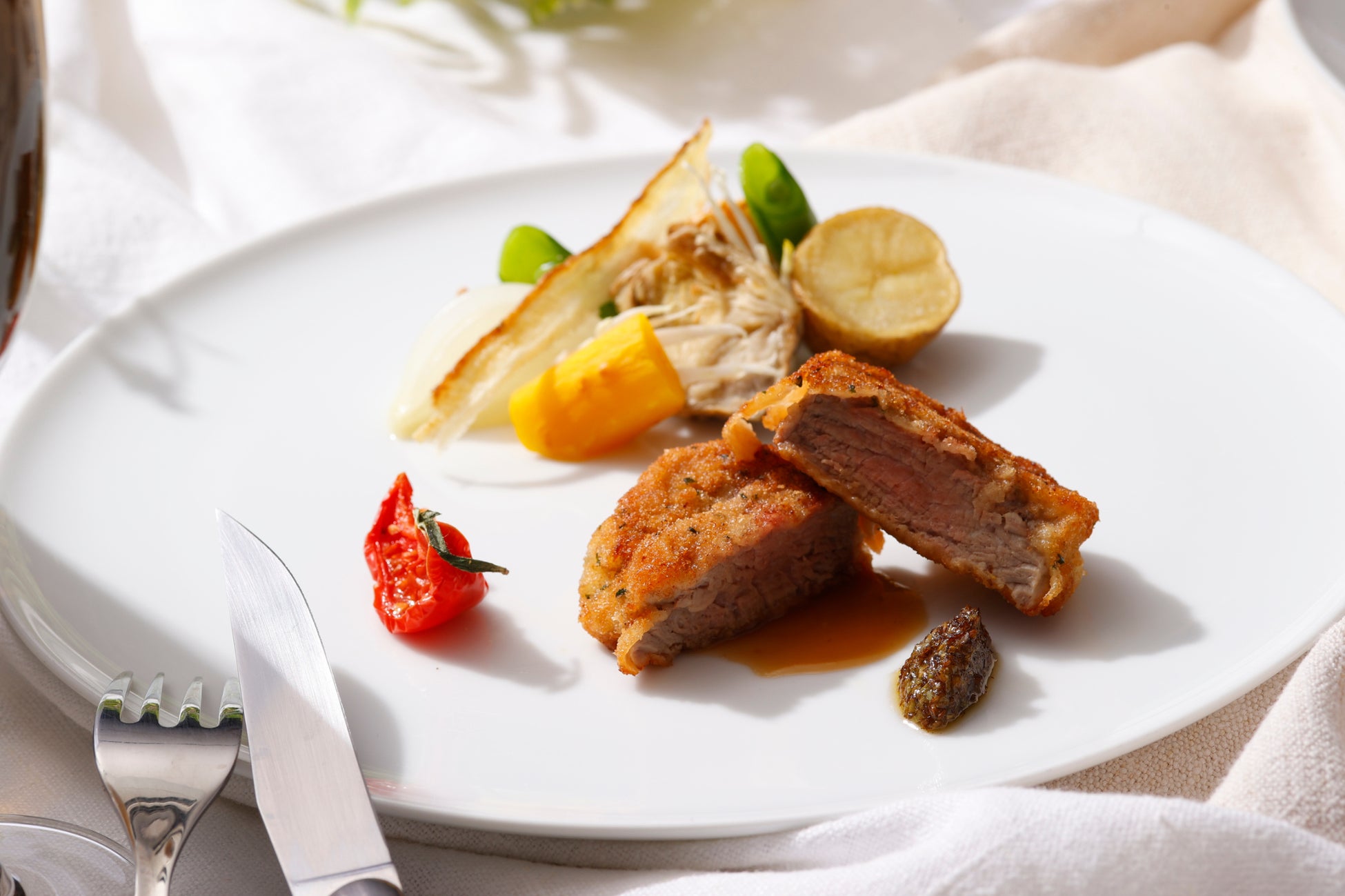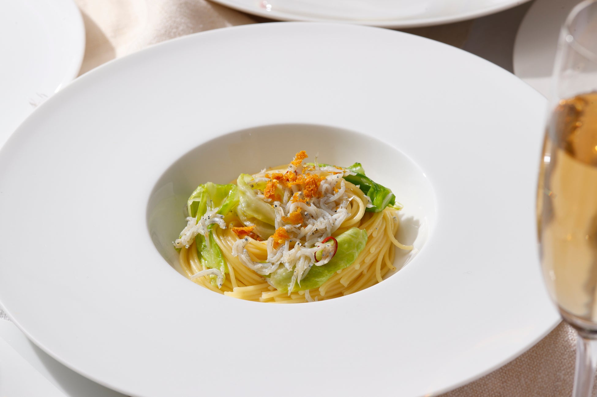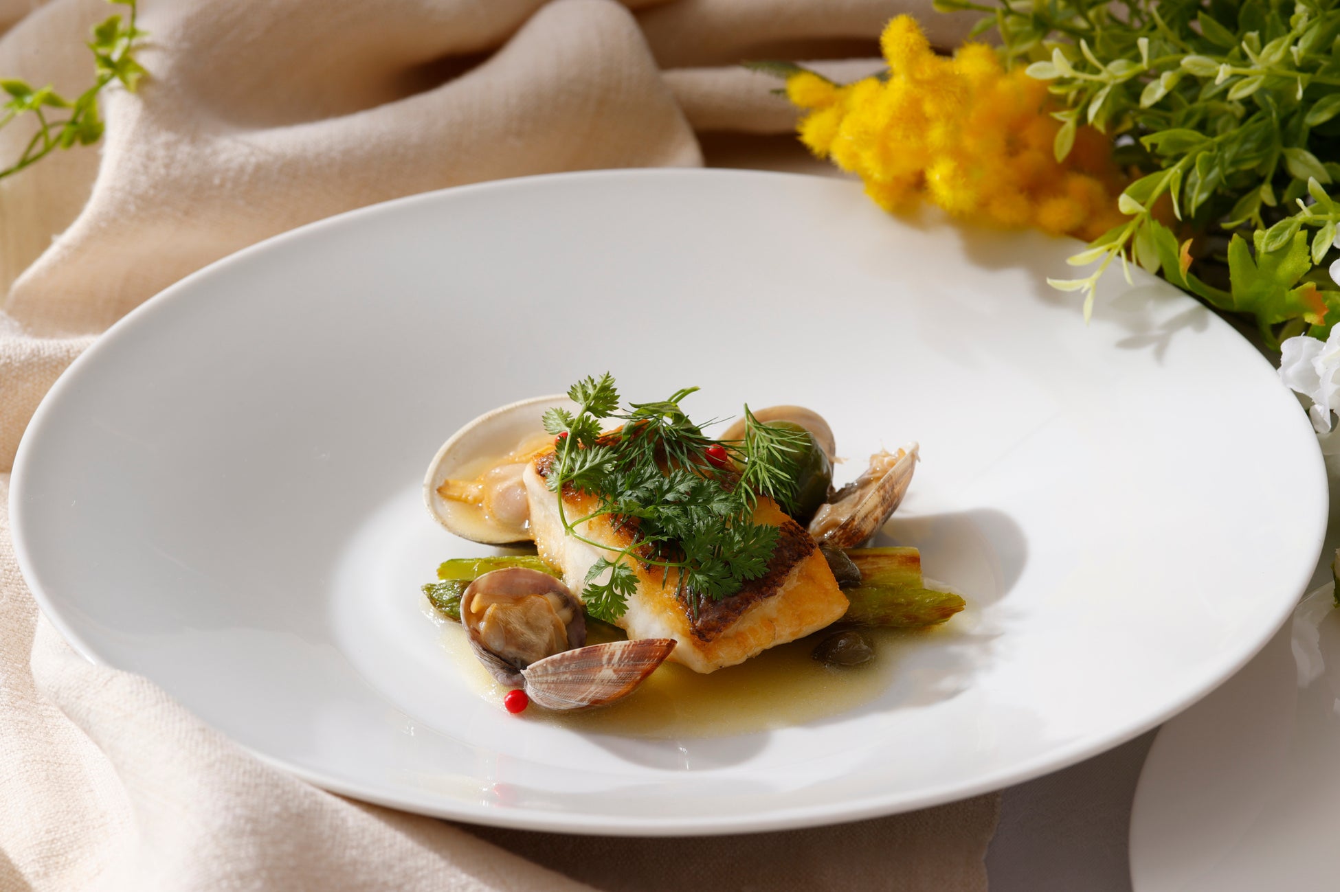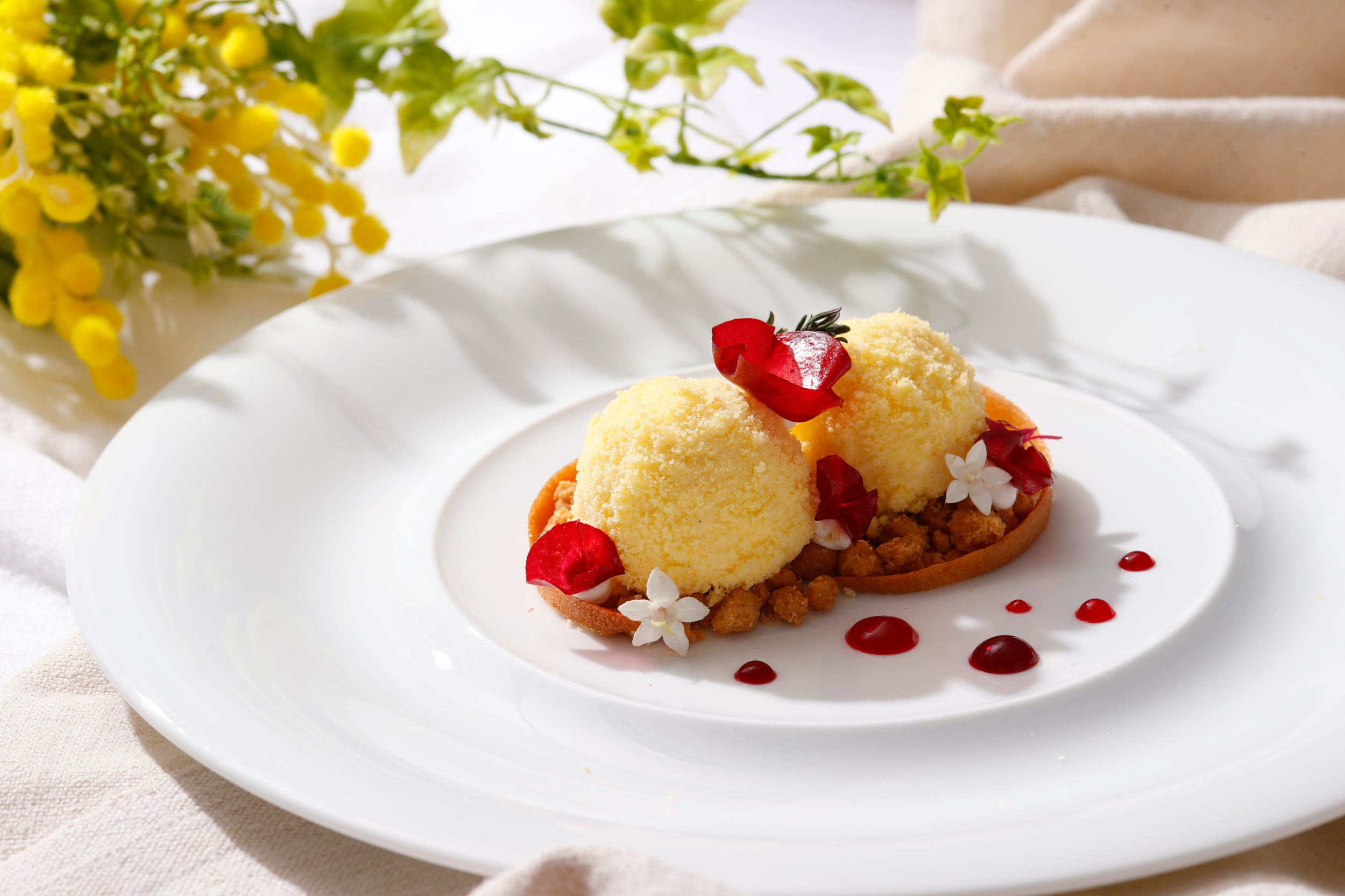 ロディジャーノチーズと熟成生ハムで咲き誇る花々に見立てた前菜は、揚げたてのゼッポリーネとともにお召し上がりいただく、春の扉をそっと開くような一品です。パスタは春キャベツとしらす、桜エビ、ホタルイカなど、その日に最もおいしい素材をシェフが厳選し提供します。三浦から直接仕入れる鮮魚を使用した魚料理では、ふっくらと蒸し焼きにした真鯛に瑞々しいアスパラガスと白蛤を添えた一皿を、肉料理では、厚みのある仔牛のフィレ肉をパン粉焼きにし、風味豊かな蕗の薹のソースのほろ苦さをアクセントにお召し上がりいただきます。食後には、春を告げるミモザの花が咲く庭園をイメージした可愛らしいドルチェをご用意しました。芽吹きの春を旬の味わいで堪能する華やかなメニューは、大切な方との“春”を愛でるお食事のひとときにおすすめです。隣接する庭園に煌めくイルミネーションとともに、身も心もほぐれてゆくような夜をお過ごしください。