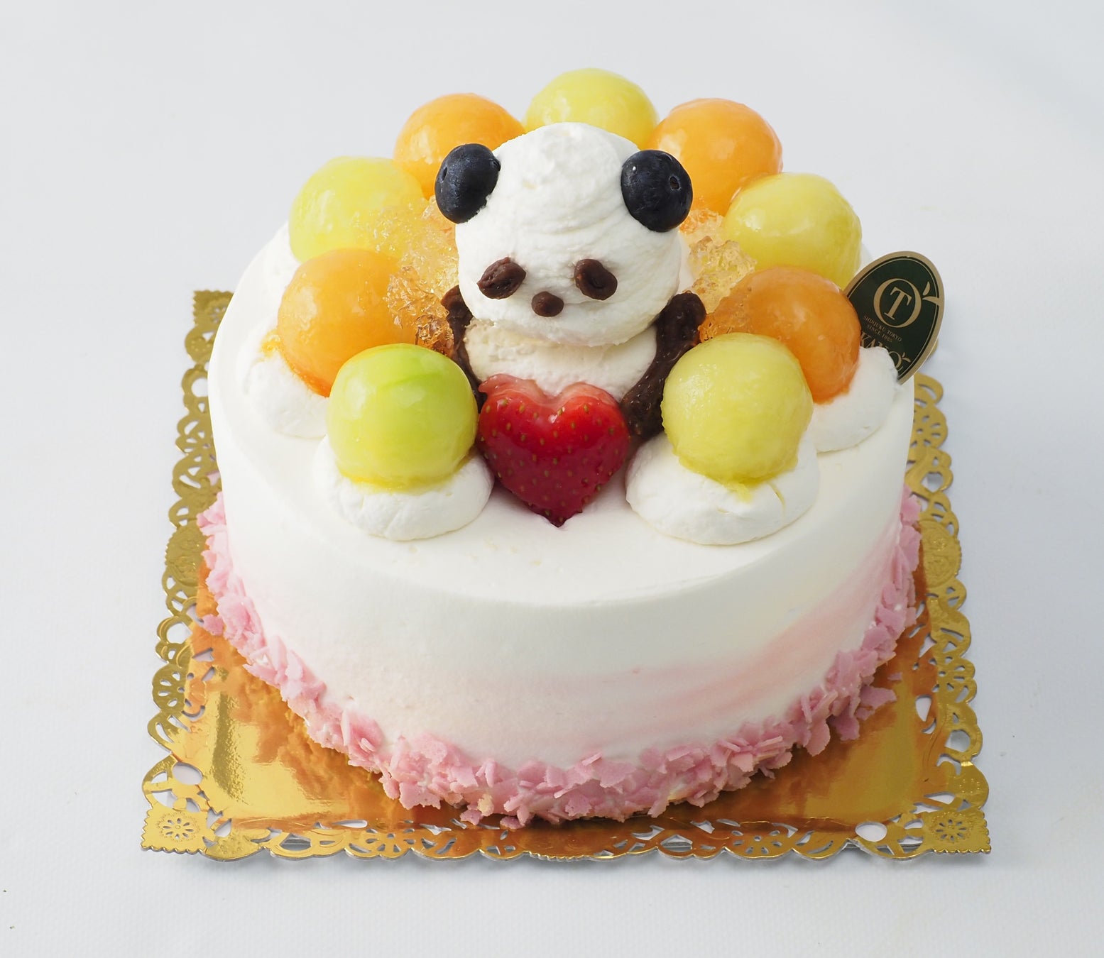 メロンとマンゴーを使用し、可愛らしいマシュマロパンダを飾ったショートケーキです。