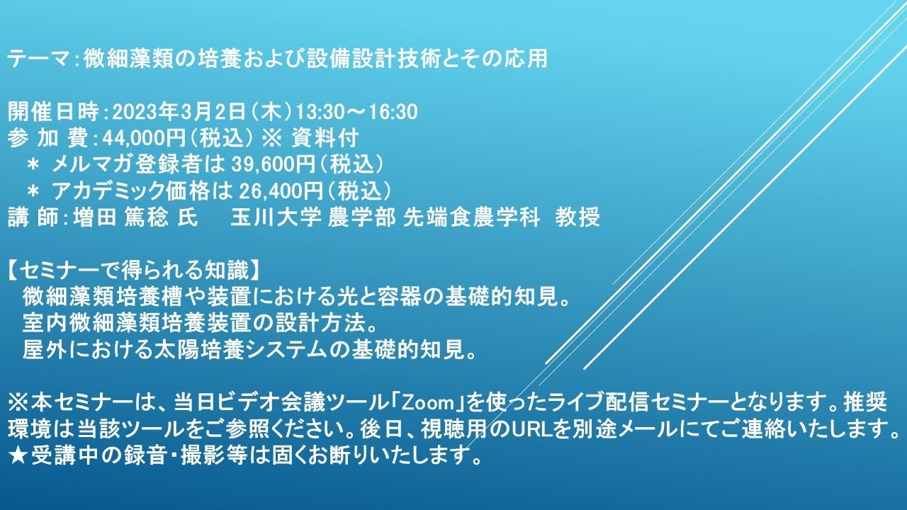先端技術情報や市場情報を提供している(株)シーエムシー・リサーチ(千代田区神田錦町: https://cmcre.com/ )では、 各種材料・化学品などの市場動向・技術動向のセミナーや書籍発行を行っておりますが、 このたび「微細藻類の培養および設備設計技術とその応用」と題するセミナーを、 講師に増田 篤稔 氏(玉川大学 農学部 先端食農学科 教授)をお迎えし、2023年3月2日(木)13:30より、 ZOOMを利用したライブ配信で開催いたします。 受講料は、 一般:44,000円、 弊社メルマガ会員:39,600円、 アカデミック価格は26,400円となっております(資料付)。