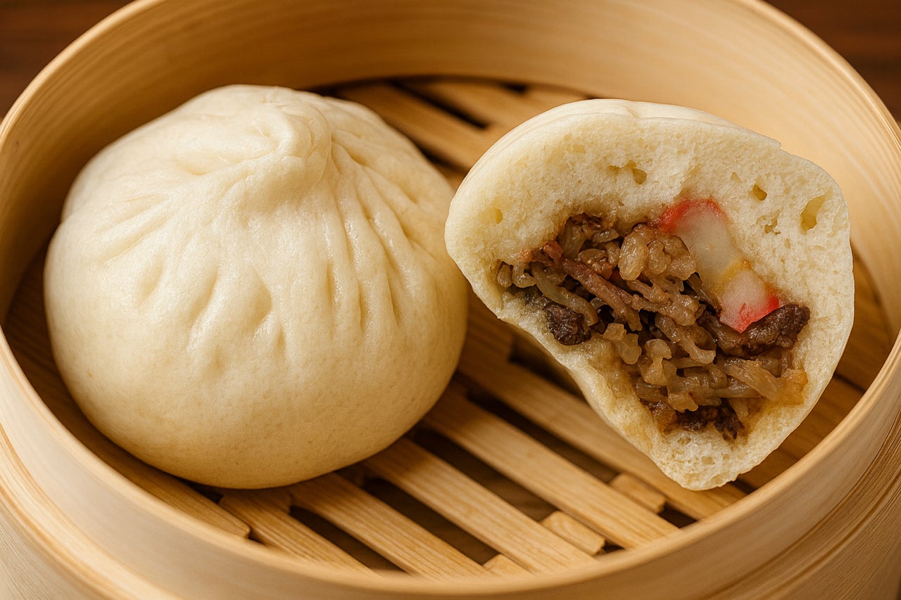 千葉県のブランド牛「かずさ牛」を使用した贅沢なすき焼きまんです。きめ細かな肉質を特製の割り下で煮込み、旨味をぎゅっと閉じ込めました。
