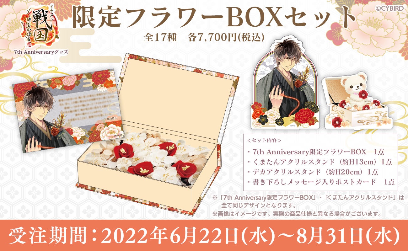 イケメン戦国の華やかな世界観をイメージした特別なフラワーBOXに、約13cmサイズの「フラワーBOXコラボくまたん」のアクリルスタンド。さらに、約20cmもある、限定デザインのデカアクリルスタンドと、七周年の感謝の言葉が綴られた、【書き下ろしメッセージ入り】のポストカードを、全てセットにしてお届けします。