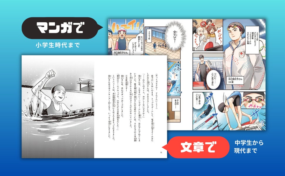 本書の制作にあたり、池江選手へ8カ月間にわたる取材を実施。競泳をはじめた3歳から小学生時代までをマンガでいきいきと、中学生時代から世界水泳2025までを臨場感ある文章で再現しました。