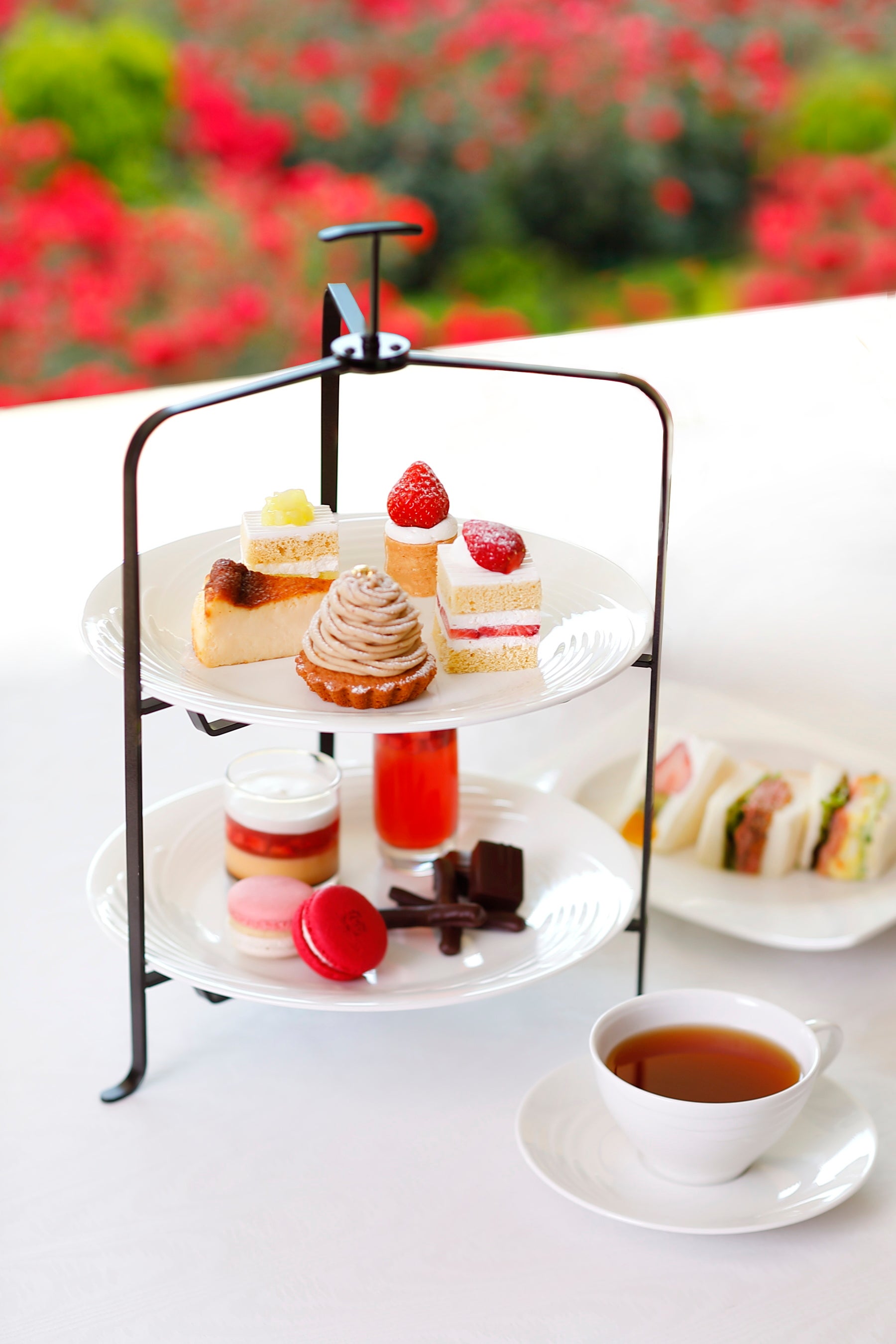 レッドローズガーデン内のウッドデッキにてアフタヌーンティーをお愉しみいただける特別なイベント。初夏の心地よい気候と赤バラに囲まれた非日常の空間で、ホテルニューオータニのシグネチャースイーツ『スーパーメロンショートケーキ』や『スーパーあまおうショートケーキ』はもちろん、多彩なあまおうスイーツを味わうことができます。