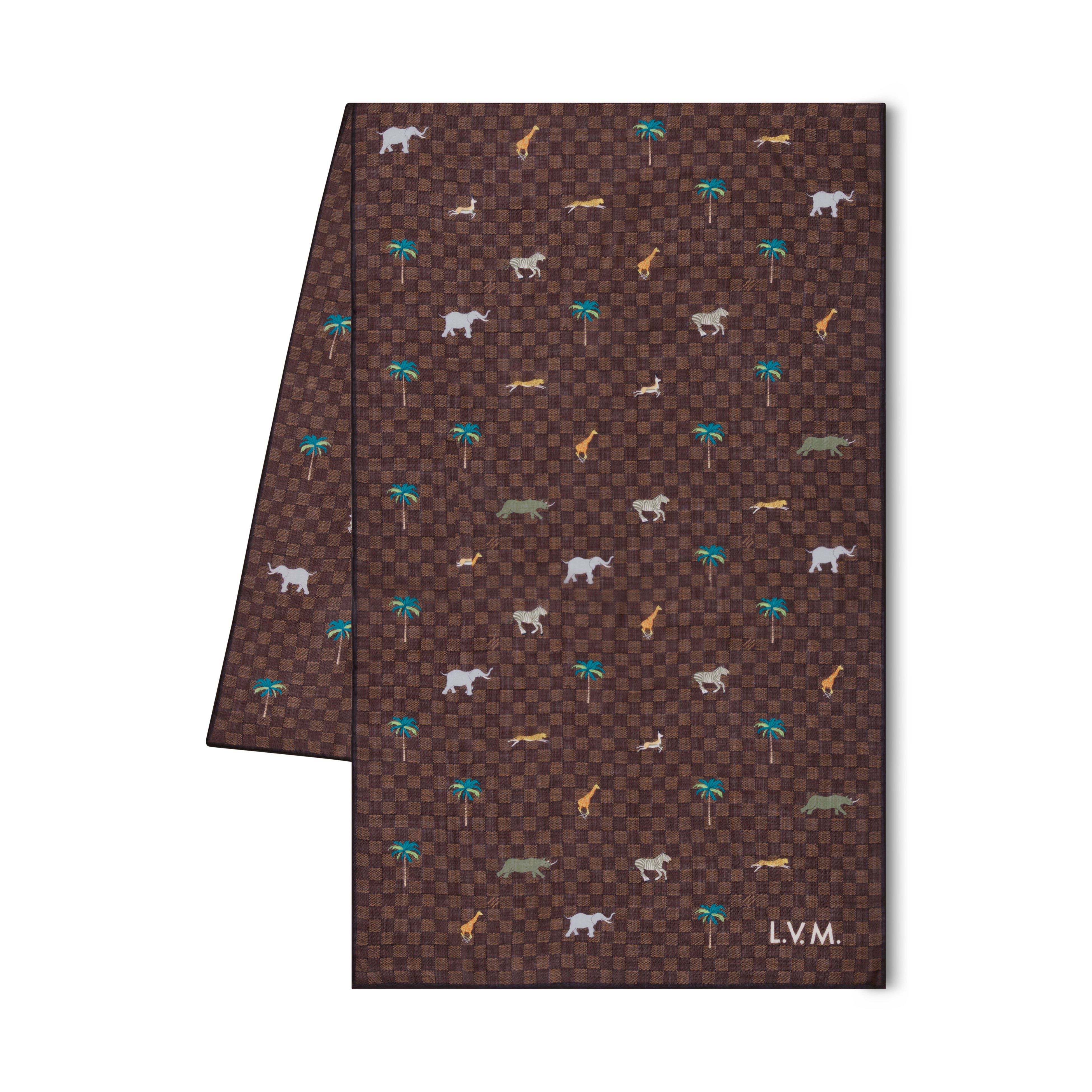 ウール100%で仕上げ、洗練されたストーリー性と映画の世界観に鮮やかなオマージュを捧げた「LV × ザ·ダージリン リミテッド ストール·ダミエ」。ブラウンとブラックのチェック·パターンに、ウェス·アンダーソン監督による2007年の映画『The Darjeeling Limited(ダージリン急行)』に登場する架空のラゲージをイメージして特別にデザインされた、ファッショナブルなアニマル·モチーフを重ねています。