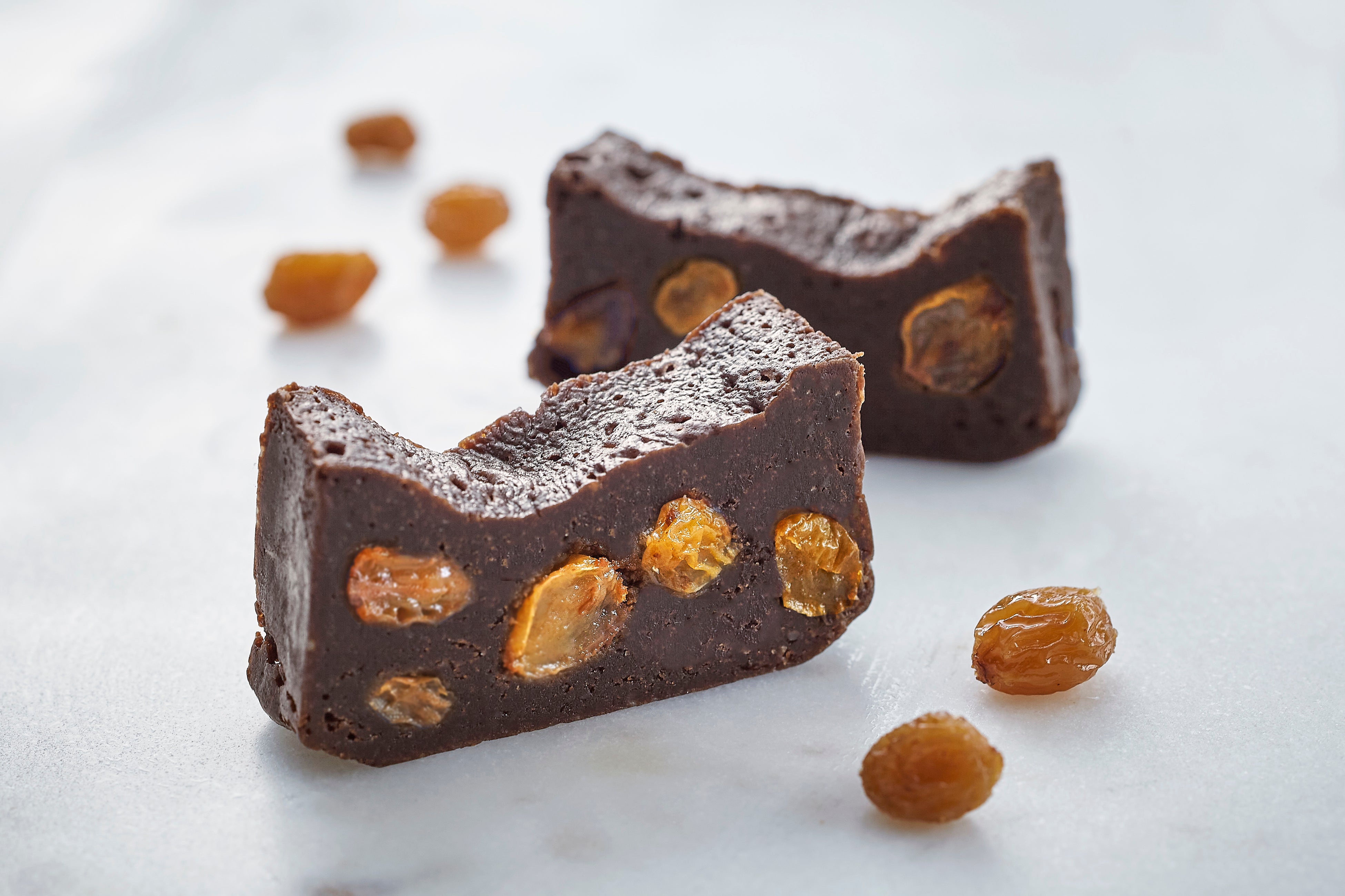 ビターチョコとミルクチョコを絶妙なバランスで配合することにより、濃厚でありながらもすっきりとした後味に仕上がっています。焼成の温度を調節し、外側から中心にかけて火の入れ方にこだわりました。中までしっとりした濃厚な生地に焼きあげ、レーズンの香りも一緒に閉じ込めています。