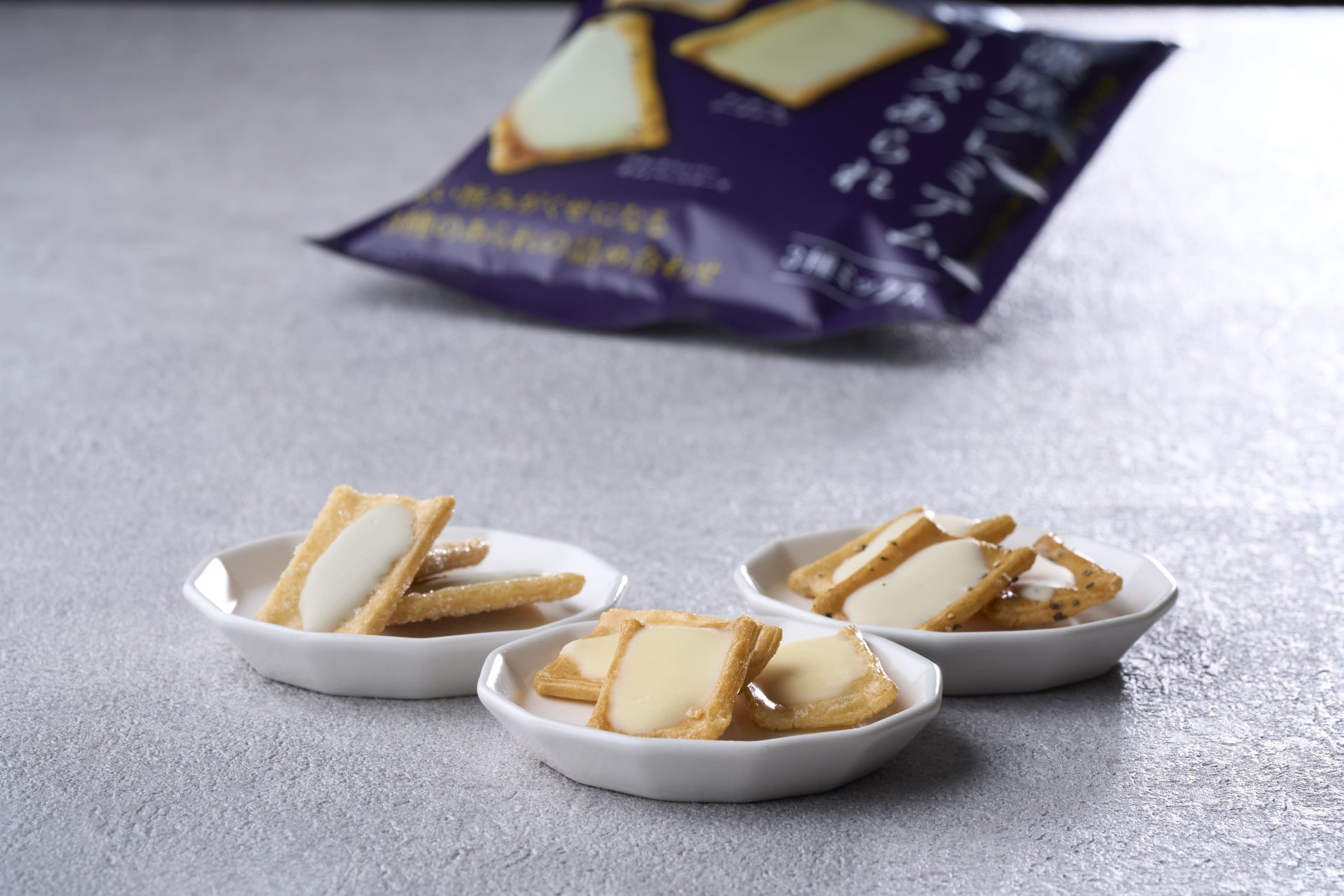 杵搗きおかきと海苔でまろやかなチーズクリームをサンドしました。チーズクリームがほんのり甘いため、お召し上がりやすくお子様からご年配のかたまでご支持いただいている商品です。