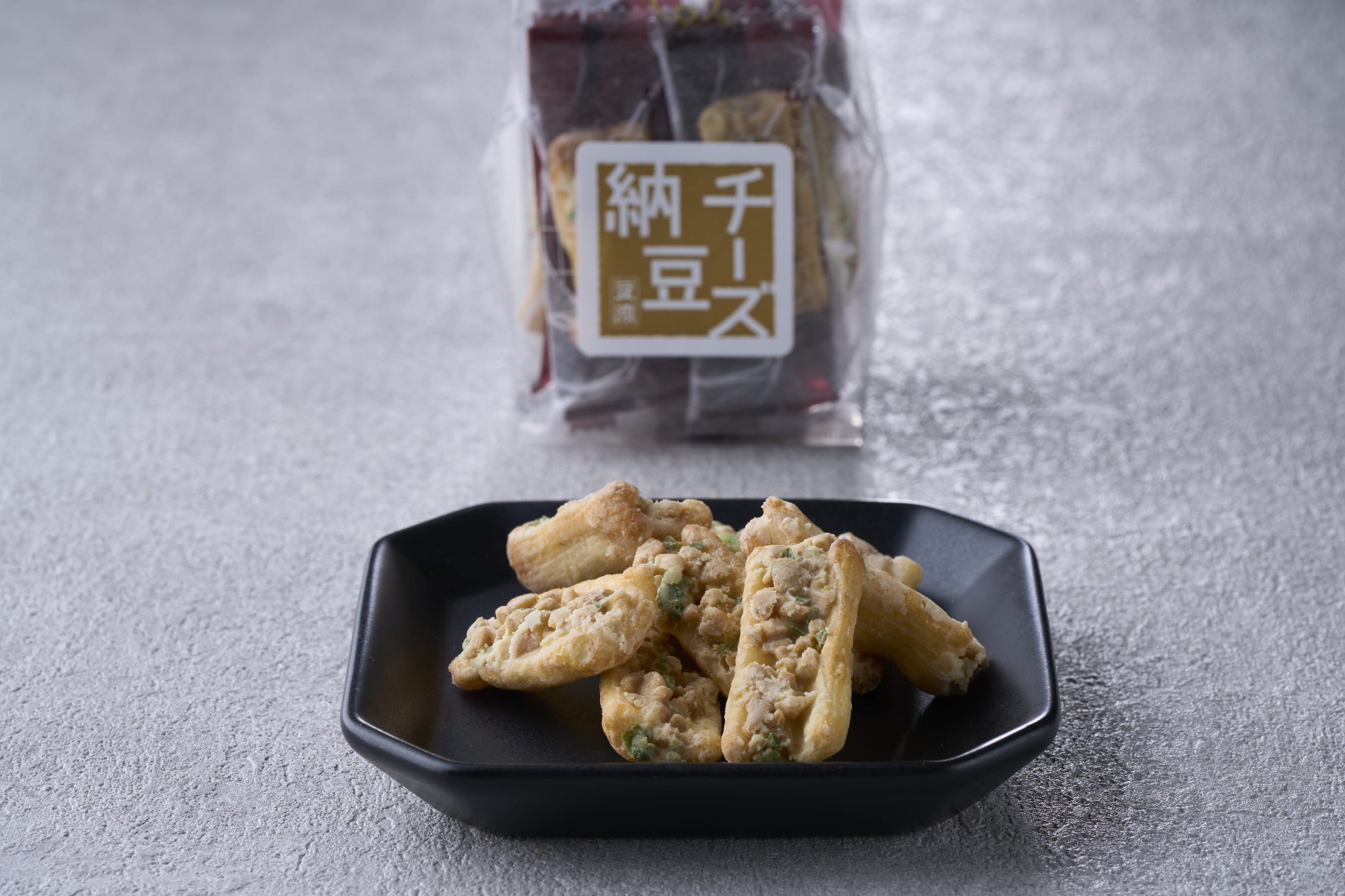 醤油味のおかきに納豆と和えたチーズクリームをのせました。