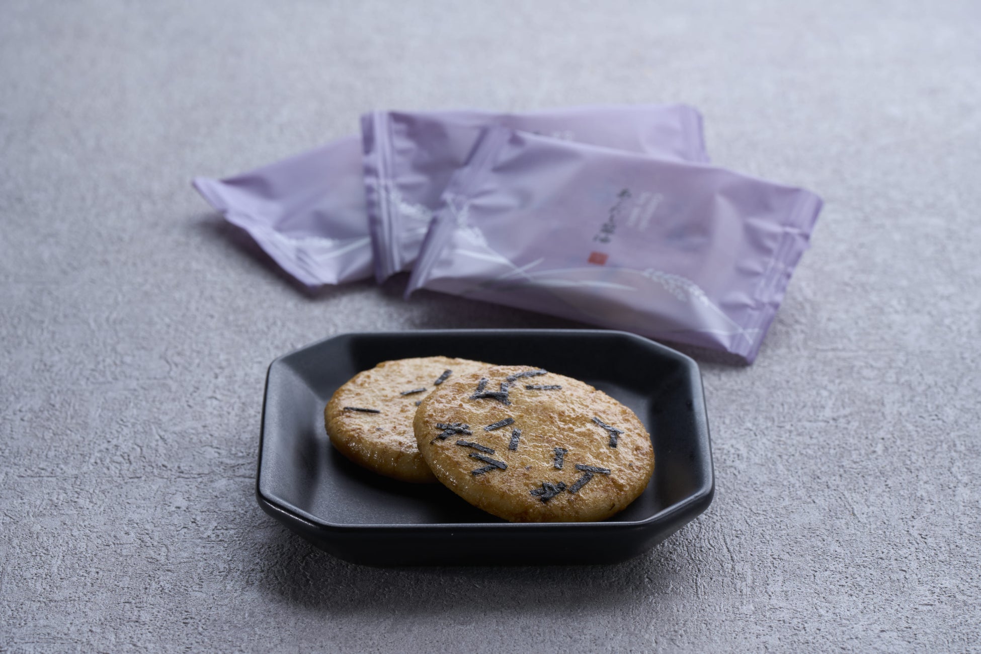 有明海産の焼海苔をくるっと巻いたおかき。磯の香りが広がる贅沢な一品。一口サイズで個包装。