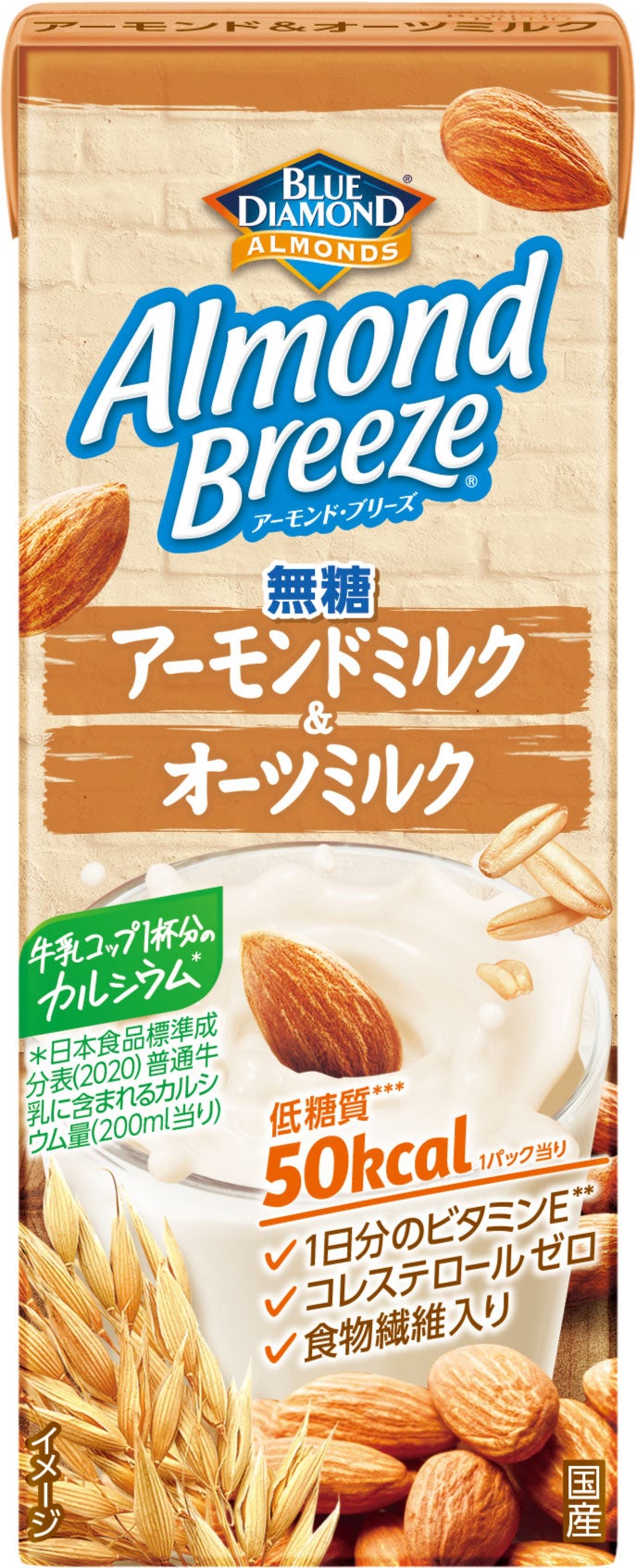 そこで当社は、2つの植物性素材を同時に楽しめる、無糖タイプの植物性ミルクとして「アーモンド・ブリーズ アーモンドミルク&オーツミルク無糖」と「アーモンド・ブリーズ アーモンドミルク&ココナッツミルク無糖」を新発売します。2つの植物性素材を掛け合わせることで、それぞれに含まれる栄養成分が摂れることに加え、ブレンドタイプならではの豊かな味わいが実現しました。素材由来の甘みを活かし、無糖で低糖質(※3)な設計なので、日頃から健康を気にされている方にもおすすめです。また、1本でカルシウムや1日分のビタミンE(※4)など、身体に嬉しい成分を手軽に補給することができます。