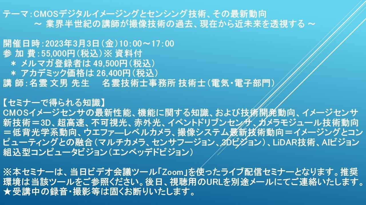 【ライブ配信セミナー】CMOSデジタルイメージングとセンシング技術、その最新動向~ 業界半世紀の講師が撮像技術の過去、現在から近未来を透視する~ 3月3日(金)開催 主催:(株)シーエムシー・リサーチ