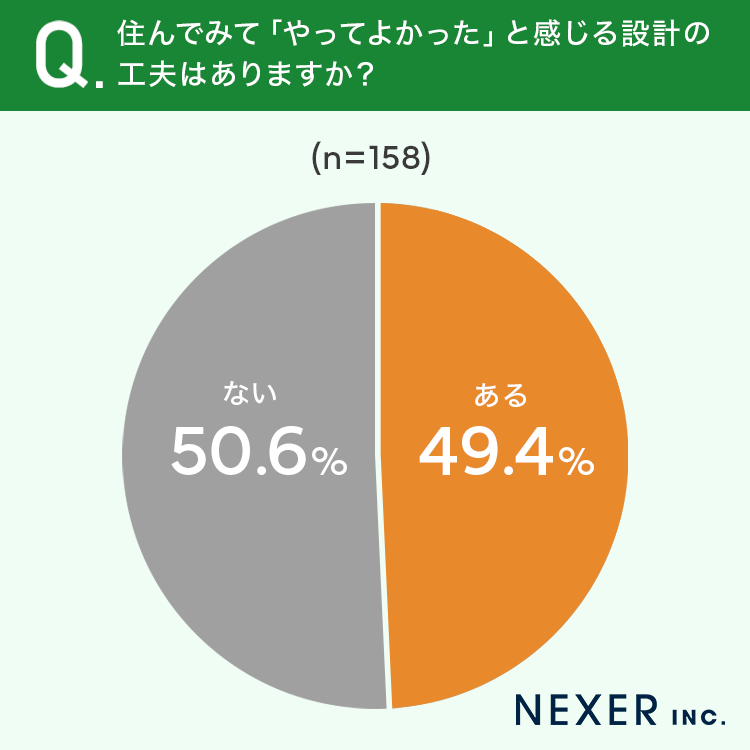 その結果「ある」と回答した人は49.4%、「ない」と回答した人は50.6%でした。ほぼ半数の人が、住んでから「この工夫をしておいてよかった」と実感できるポイントがあることがわかります。