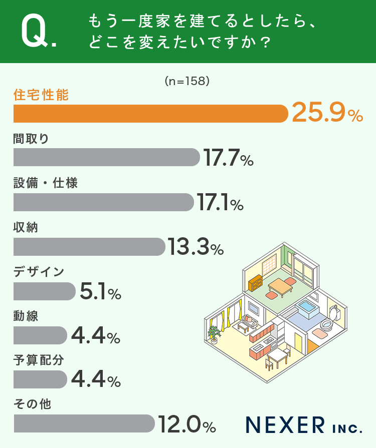 最も多かった回答は「住宅性能」で25.9%でした。次いで「間取り」が17.7%、「設備・仕様」が17.1%、「収納」が13.3%と続いています。