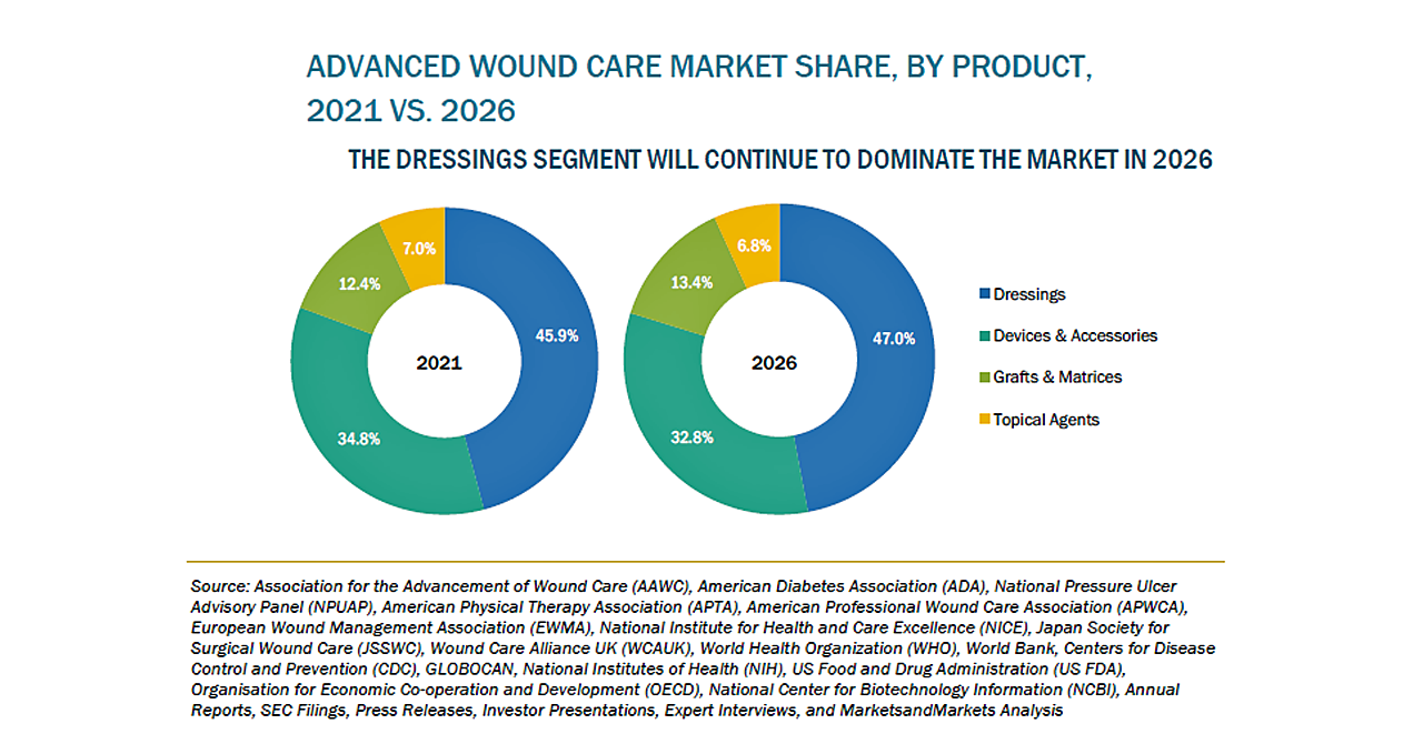 先進的な創傷ケアの市場規模は、2021年の94億米ドルからCAGR6.2%で成長し、2026年には128億米ドルに達すると予測されています。市場の成長は、慢性的な傷に対する支出の増加、技術の進歩、創傷治癒能力に影響を与える疾患や状態の有病率の増加によってもたらされます。
