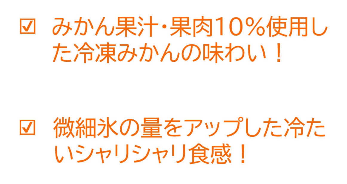 冷凍みかんの風味を引き立たせるために、みかん果汁・果肉を10%使用した、みかんのフルーティーな味わいが楽しめます。