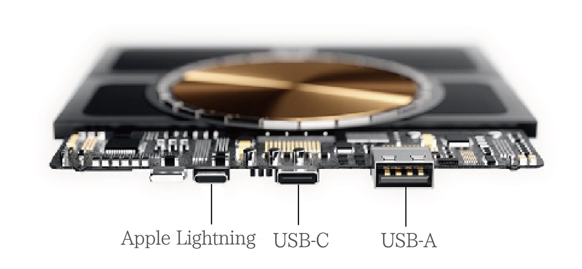 USB、Type-C、Lightningの3つのポートを内蔵し、USBとType-Cは最大27W、Lightningは20Wに対応しています。