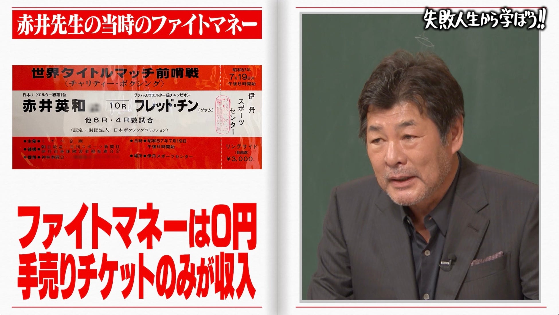 高校・大学でボクシング界に名を轟かせ、「オリンピックで金メダル獲ったるで!」とプロの道へ進んだ赤井先生。プロデビューから12戦連続KO勝利という当時の日本記録を達成し、8戦目以降はテレビ放映までされる異例の人気ぶりで、“赤井ブーム”を巻き起こしました。しかしその裏で、「ファイトマネーは0円。売りチケットのみが収入」という驚きの実態を告白。「テレビの放映権であったり、激励賞もあったんでしょうけど、そういうのは全く入らず」「当時は一生懸命で全然わかってなかった」と語りました。さらに「会長とともに騙されていたのか?」という問いに赤井先生が「会長が…」と意味深に語り、「4畳半のジム作ってたところが、駅前にビルが建った」「ここが一番のしくじり」と振り返る場面では、教室中がざわつきました。