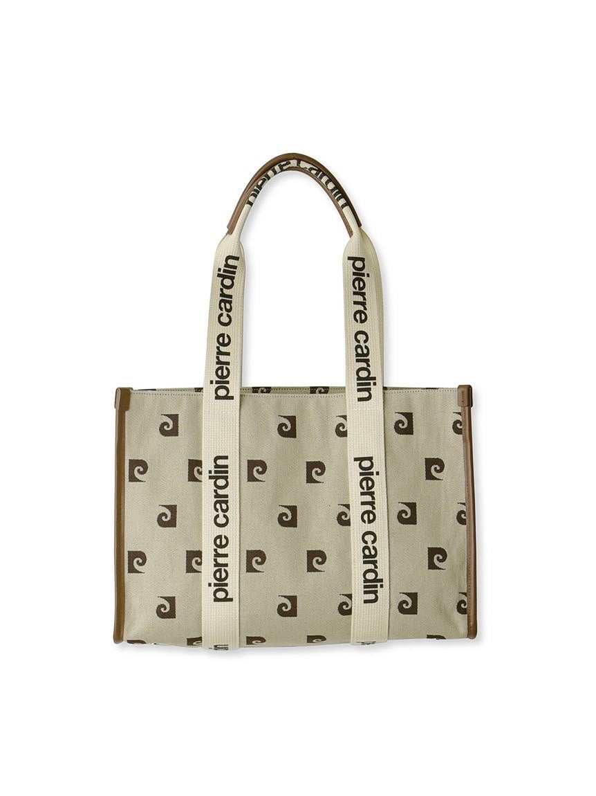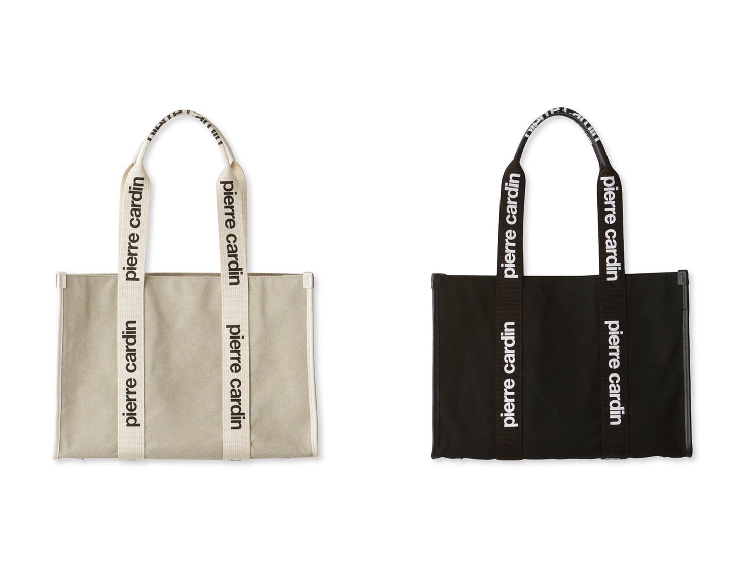 キャンバス生地のバッグにpierre cardinのロゴ入りのベルトを大胆にあしらった、存在感あるトートバッグ。