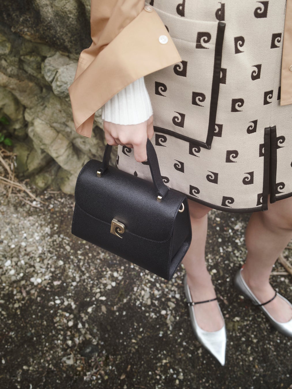 Pロゴのメタルパーツが目を引くクラシカルなハンドルバッグ。