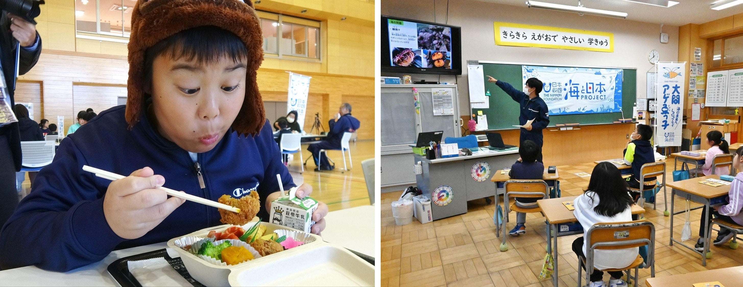 11月13日(月)~17日(金)を、”いい魚(さかな)週間”の「海の食育ウィーク」として設定。下北半島の小中学校10校において、津軽海峡産の未利用魚「ろうそくホッケ」で作ったフライボール「アゲ魚っ子ボール」を、全校児童に味わってもらいました。給食の無い下北半島の3地域(大間町・佐井村・風間浦村)には、青森県のスーパーチェーン・㈱マエダと共同開発したお弁当「海のアゲ弁」という形で約330個を提供し、東通村・むつ市(川内・脇野沢地区)には、管轄の給食センターを通して学校給食として約660食分を無償提供しました。昼食時間には、下北半島の海で獲れる魚や、海で起きている問題が楽しく学べるオリジナルの教材動画も視聴してもらい、さらに、海の出前講座を開いて海の学びを深めました。