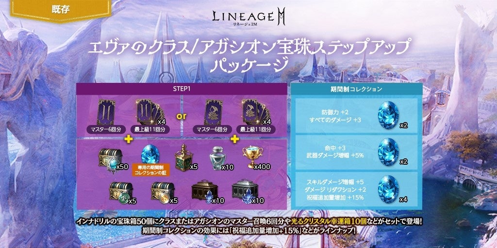 「インナドリルの宝珠保管箱(刻印)」50個に、クラスまたはアガシオンのマスター召喚6回分と最上級召喚44回分、「インナドリルのコレクションの証(刻印)」1個などがセットになった「エヴァのクラス/アガシオン宝珠ステップアップ パッケージ」が登場しました。