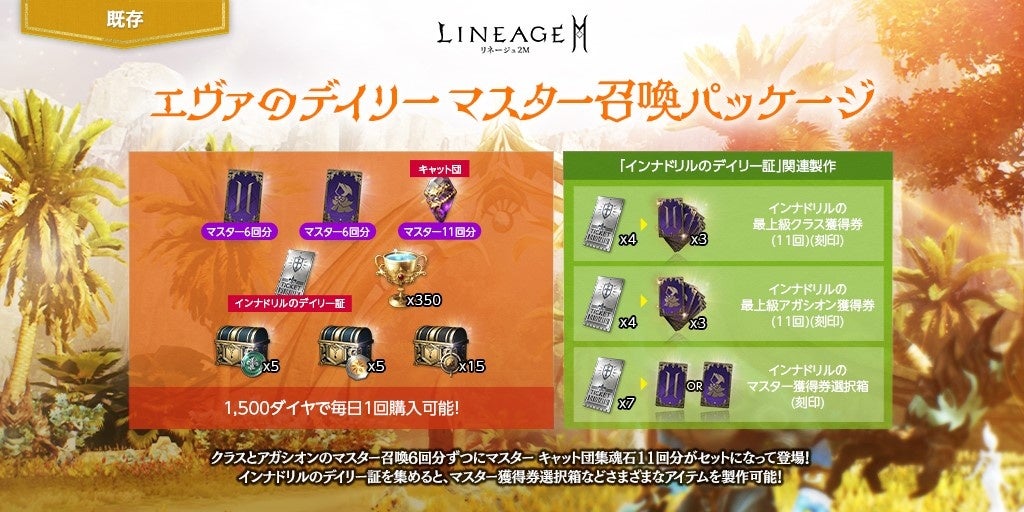 クラスとアガシオンのマスター召喚6回分と、「インナドリルのマスター キャット団集魂石(11回)(刻印)」1個、「インナドリルのデイリー証(刻印)」などがセットになった「エヴァのデイリー マスター召喚パッケージ」が登場しました。