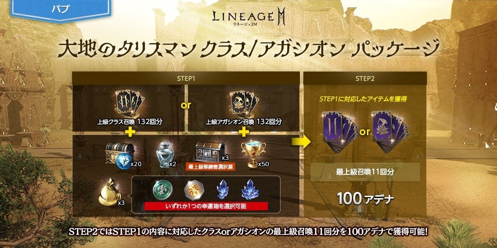 「大地のタリスマン箱(刻印)」20個に、クラスまたはアガシオン召喚132回分、「大地の最上級修練書選択箱(刻印)」3個などがセットになった「大地のタリスマン クラス/アガシオン パッケージ」が登場しました。