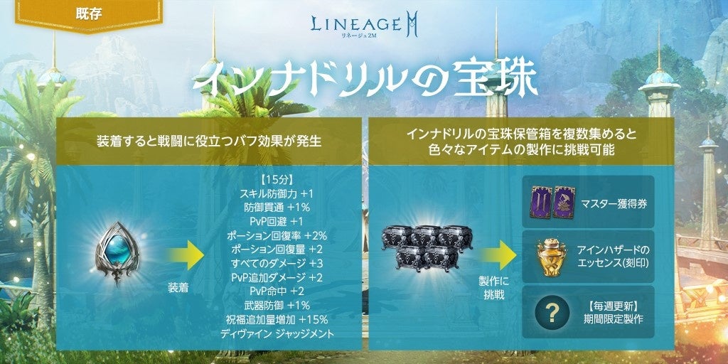 「インナドリルの宝珠」を使用して製作できるアイテムは週ごとに異なり、期間限定製作の1週目ラインナップには、「インナドリルの豪華な神話級スキルブック選択箱(刻印)」や「インナドリルの光り輝く伝説級スキルブック選択冒険箱(刻印)」などのスキルブックや、「魔力が宿ったインク(伝説)」などのアイテムが登場します。