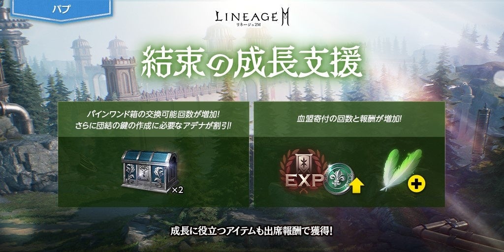 期間中、1,000アデナを使用することでオープンできる出席報酬「血盟の決意」が登場します。