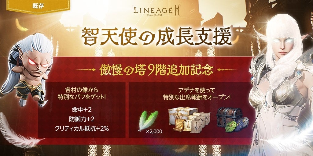また、アデン大陸の各村とワールド ダンジョン「傲慢の塔」「ベオラの遺跡」、マスター ダンジョン「ベオラの宮殿」のロビーに「空虚な智天使のバフ銅像(イベント)」が出現します。「空虚な智天使のバフの銅像(イベント)」に話しかけることで、4時間維持される「命中 +2」「防御力 +2」「クリティカル抵抗 +2%」のバフを受けることができます。