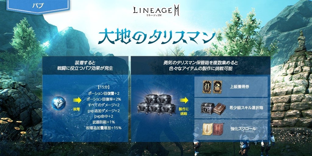 「勇気のタリスマン保管箱(刻印)」を使用して製作できるアイテムは週ごとに異なり、期間限定製作の1週目ラインナップには、各武器種の「大地の英雄級スキルブック選択箱(刻印)」が登場します。