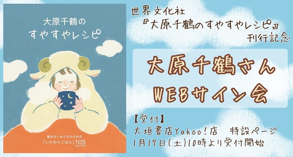 『大原千鶴のすやすやレシピ』の刊行を記念し、Yahooショッピング内「大垣書店Yahoo!店」限定で大原千鶴さんによるWEBサイン会を開催します。先着50様限定です。ふるってご応募ください。