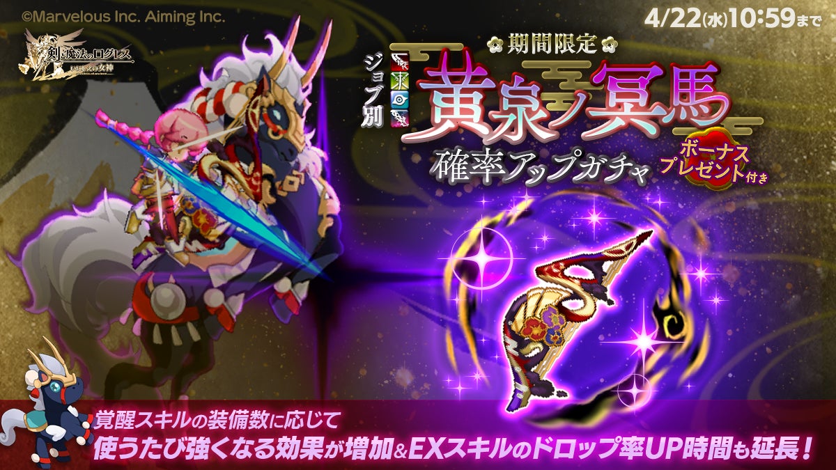 株式会社マーベラス(代表取締役社長:照井 慎一/所在地:東京都品川区)は、スマートフォン向け本格オンラインRPG『剣と魔法のログレス いにしえの女神』において、2026/4/15(水)に「ジョブ別 黄泉ノ冥馬確率アップガチャ」の販売、および「ルイン大決戦」の開催を含むアップデートを行ったことをお知らせいたします。