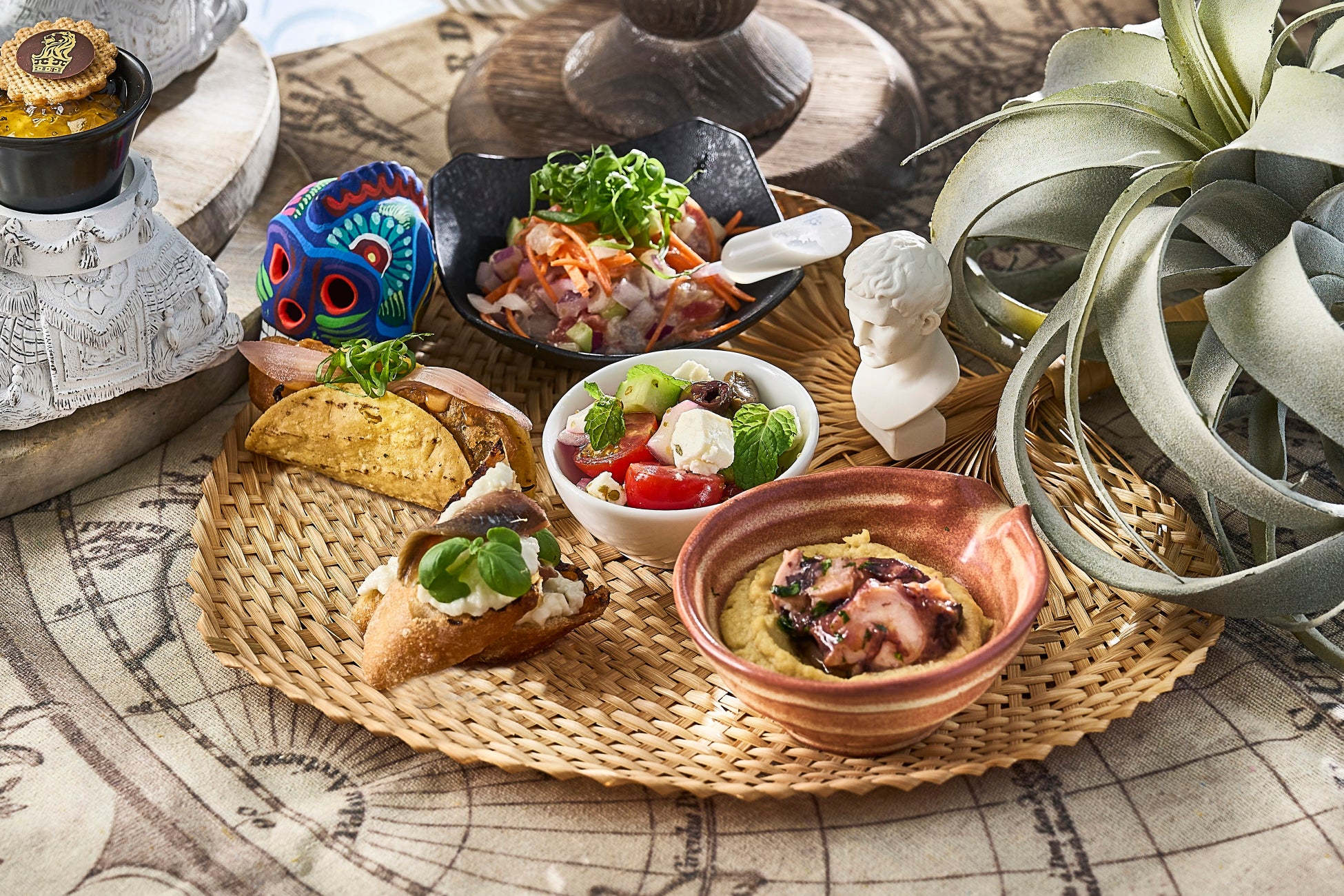 セイヴォリーは、イタリア・シチリア島出身の料理長ナタレ・アレッシオ・ラ・バルベラが手がける、冷製料理4種と温製料理1種をご用意。お料理本来の美味しさを引き立てる温度にもこだわり、セイヴォリーはスタッフがお客様のテーブルへお持ちいたします。シチリア島の雄大な景観と紺碧の海に着想を得た「ストラッチャテッラとアンチョビのブルスケッタ」、ギリシャで好んで食べられるフェタチーズとみずみずしい夏野菜をシェリービネガーでアレンジした「ギリシャ風サラダ」。「ポリネシアン風セビーチェ」は、シェフ・アレッシオがかつてキャリアを積んだボラボラ島の伝統料理にインスパイアされた冷菜。ライムの爽やかさとココナッツミルクのコクで、魚介のマリネをトロピカルに仕上げました。また「タコとシャルモラサラダ添えフムス」や「アラスカ産スケトウダラのフライタコス」など、各国の夏の味覚をシェフ アレッシオがイタリア料理の技でアレンジした、今回だけのスペシャルメニューでお客様をお迎えします。