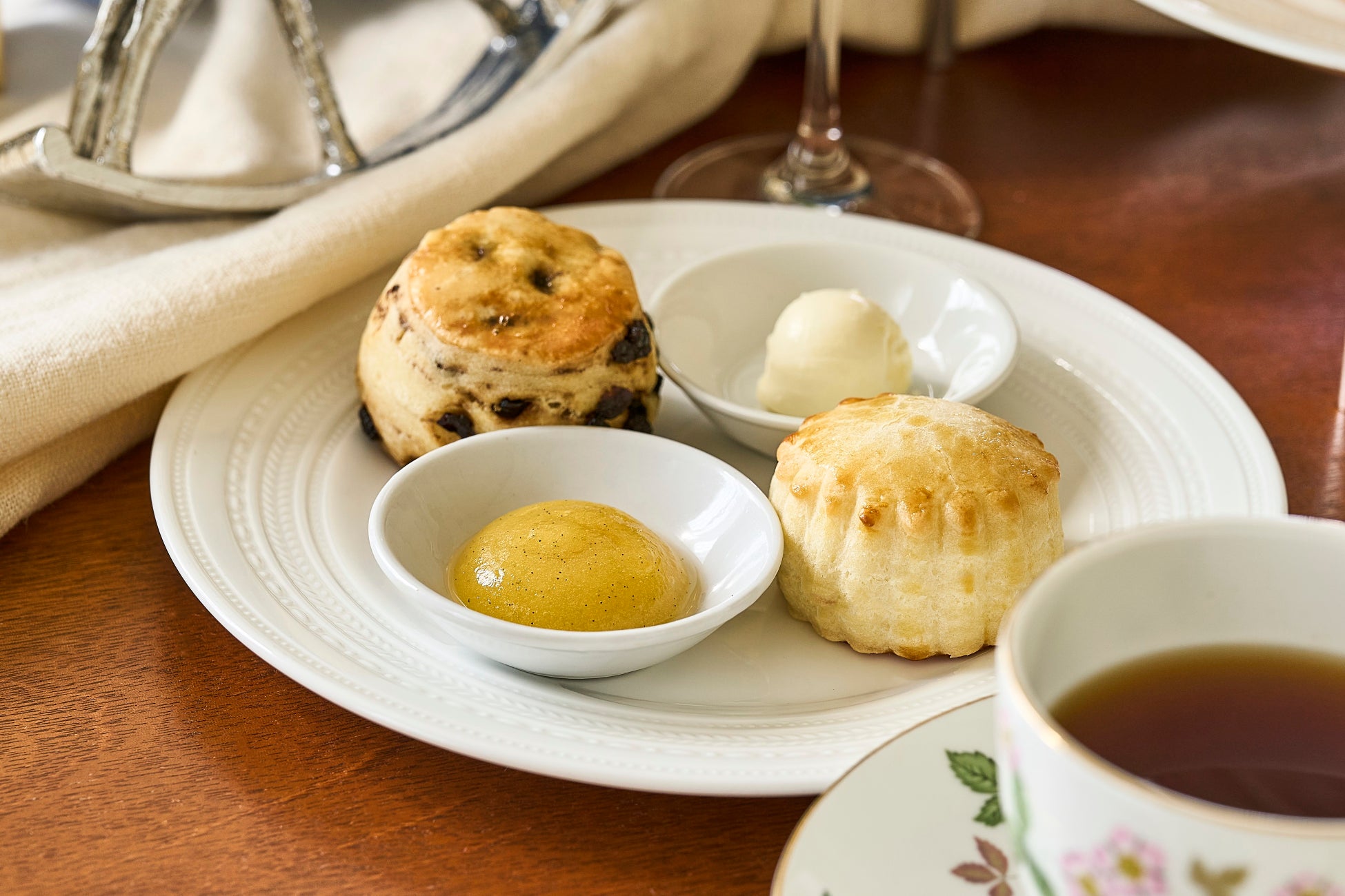 彩り豊かなスイーツやセイヴォリーに合わせて、ドイツのロンネフェルト社公式認定の資格「ティーマスター シルバー」を持つ佐藤天音、木田幸子が厳選したティーセレクションもザ・ロビーラウンジのアフタヌーンティーの魅力のひとつです。セイロンティーに、矢車菊の花びらとカシスの香りを加えた華やかな味わいが楽しめる「ザ・リッツ・カールトン大阪 オリジナルブレンドティー」や、中国緑茶をベースに、バラや矢車菊の花びら、マンゴーの香りをまとわせた華やかな「モルゲンタウ」など5種類の紅茶をご用意。真夏の庭園で咲き誇る美しい花々のような華やかさと夏らしいフルーティーさをお楽しみいただけるラインナップです。