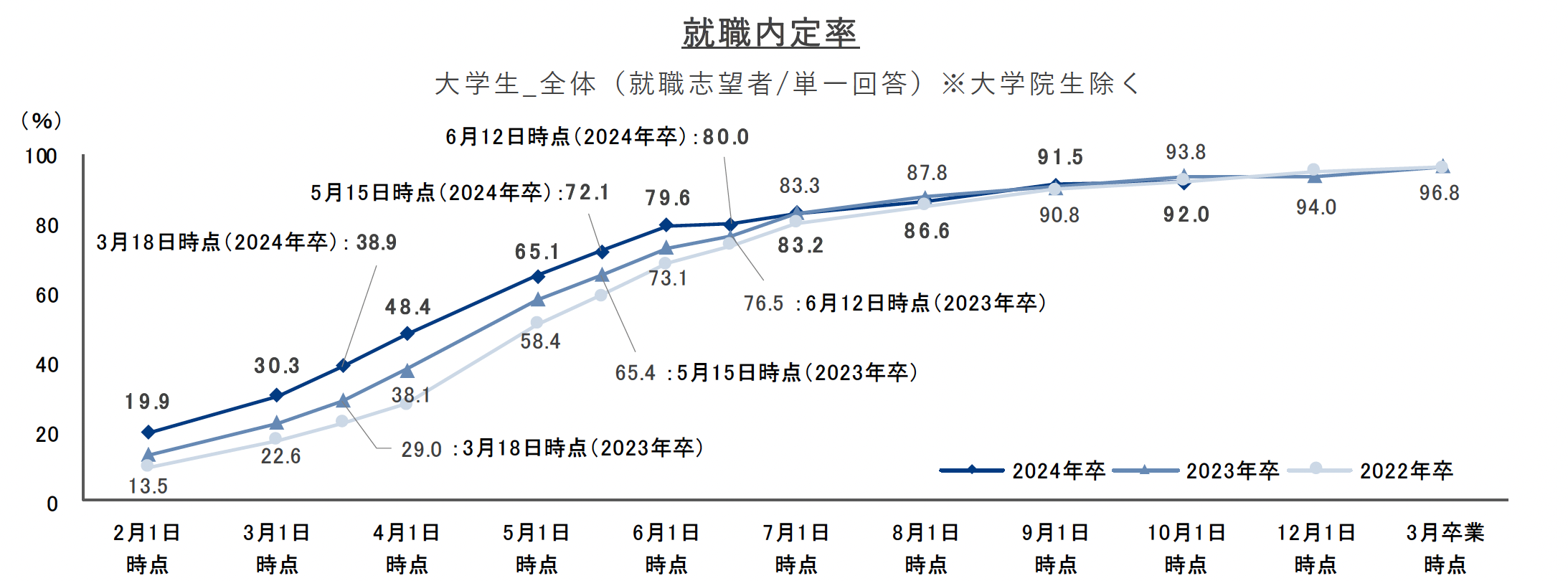10月1日時点の大学生(大学院生除く)の就職内定率※1は、92.0%(-1.8ポイント)※2と、前年同水準の結果となりました。進路確定率も88.2%(+1.1ポイント)と前年同水準です。内定式に参加した学生からは「内定式に出席した際、今まで以上に社員の方々とお話しさせていただき雰囲気をより感じることができた。そして、この会社に入社を決めて良かったと感じた」「内定式があり、多くの先輩方とお話をする中で不安に感じていたことも解消された」など、内定式を機に入社予定企業への理解を深め、入社に向けて前向きな気持ちになったという声が聞かれました。一方で、「配属が未だ決まっていないのが不安に感じた」「内定先は納得できるところになったが、現在は、その中でのキャリアをどうすれば良いか悩んでいる」など今後の自身のキャリアに不安を感じている様子もうかがえます。入社予定企業で働くことの解像度を上げられる情報を得ることが、学生の不安軽減につながると考えられます。入社後の活躍を見据え、企業から積極的にコミュニケーションの機会を設けていただくことを期待しています。進路が確定していない学生からは「就活は1人で完結するわけではなく、周りの人の力も必要だと感じています」という声も寄せられました。キャリアセンターなど周囲の協力を得ながら就職活動を続けることで、納得のいく進路決定をしていただきたいです。