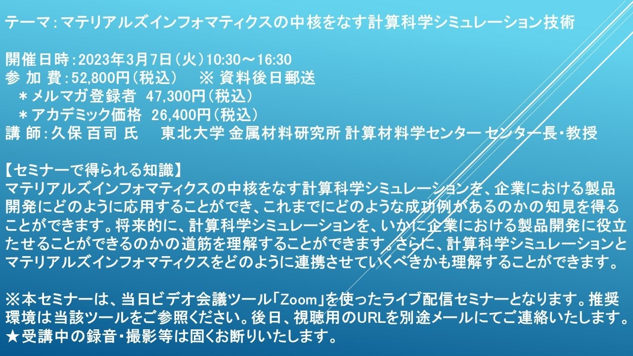 先端技術情報や市場情報を提供している(株)シーエムシー・リサーチ(千代田区神田錦町: https://cmcre.com/ )では、 各種材料・化学品などの市場動向・技術動向のセミナーや書籍発行を行っておりますが、 このたび「マテリアルズインフォマティクスの中核をなす計算科学シミュレーション技術」と題するセミナーを、 講師に久保 百司 氏 (東北大学 金属材料研究所 計算材料学センター センター長・教授)をお迎えし、2023年3月7日(火)10:30より、 ZOOMを利用したライブ配信で開催いたします。 受講料は、 一般:52,800円(税込)、 弊社メルマガ会員:47,300円(税込)、 アカデミック価格は26,400円(税込)となっております(資料後日郵送)。