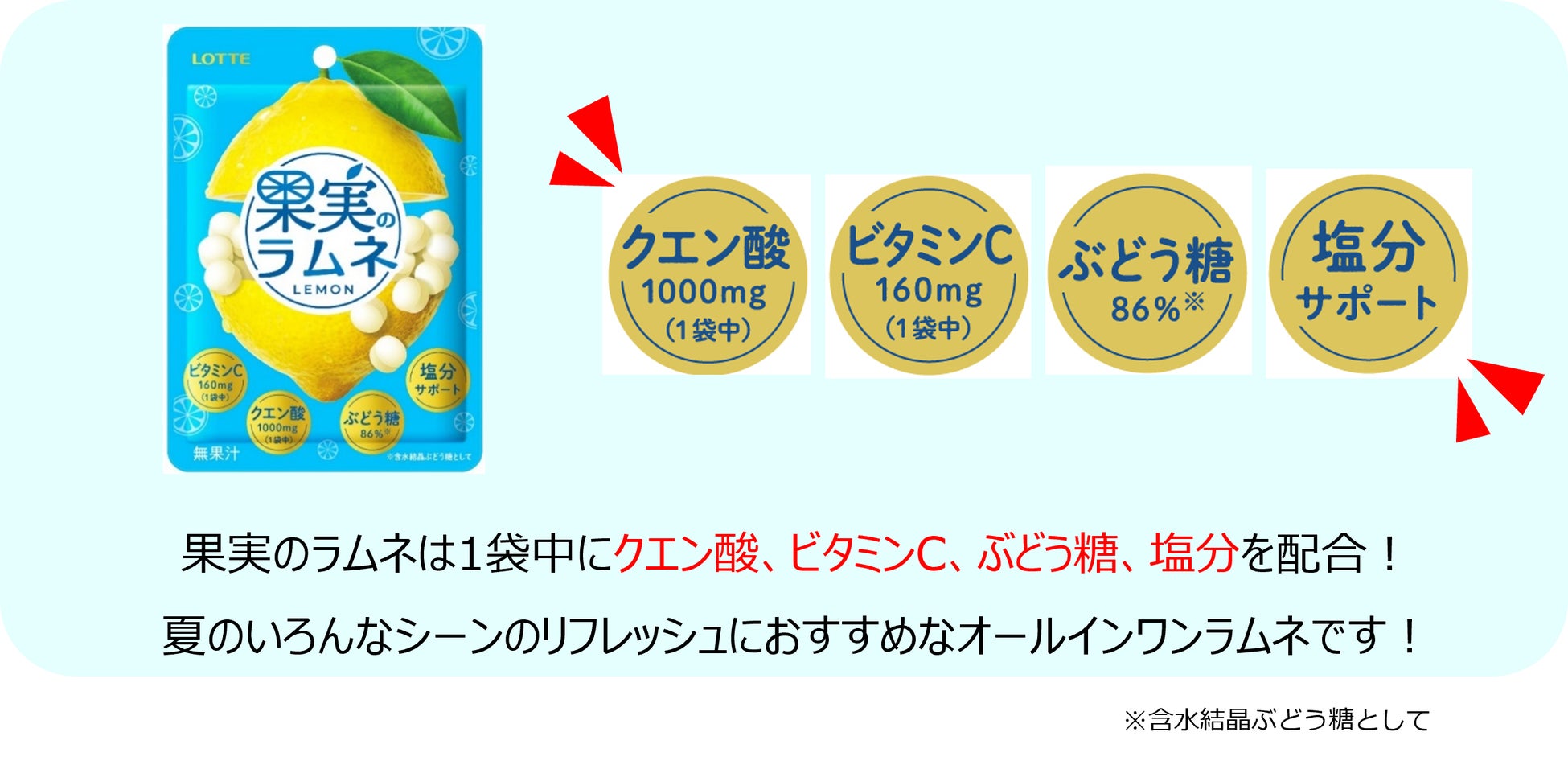 株式会社ロッテは5月28日(火)に「果実のラムネ<レモン>」を発売します。これから暑くなる季節に合わせ、様々なシーンでおいしくリフレッシュできるラムネを目指しました。レモンの風味を楽しめるのはもちろん、塩分、ビタミンC、クエン酸、ぶどう糖の4つの素材を配合した、一石五鳥のラムネです。