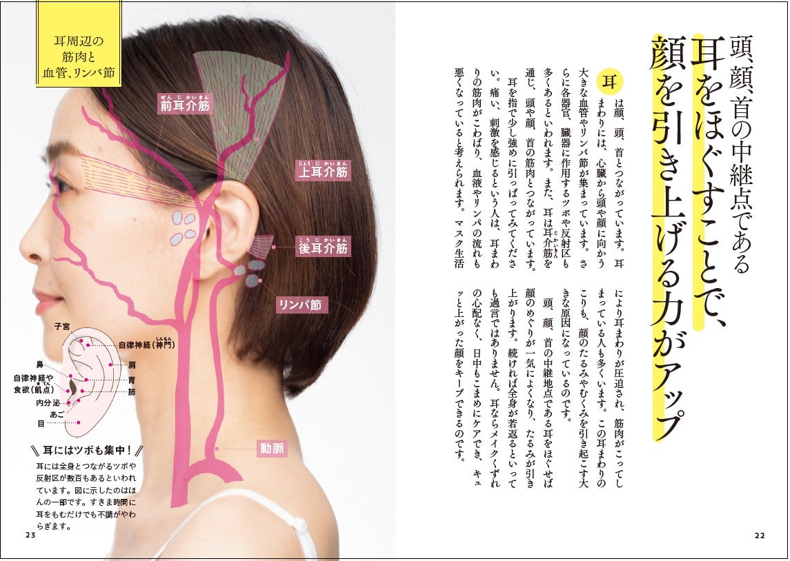 「顔をリフトアップするには、まず耳まわりからケアするのが正解です」と村木さん。耳の周りには顔や頭につながる血管が通り、リンパ節も集中。耳まわりをほぐせばめぐりを一気に改善し、顔を立体的に引き上げることができるのです」と、「V字耳リフト」「たるみ筋はがし」「耳ぎょうざポンプ」というユニークなメソッドを伝授。10秒ほどで顔がぽかぽかとし、斜めに垂れ下がった顔がぐっと引きあがります。