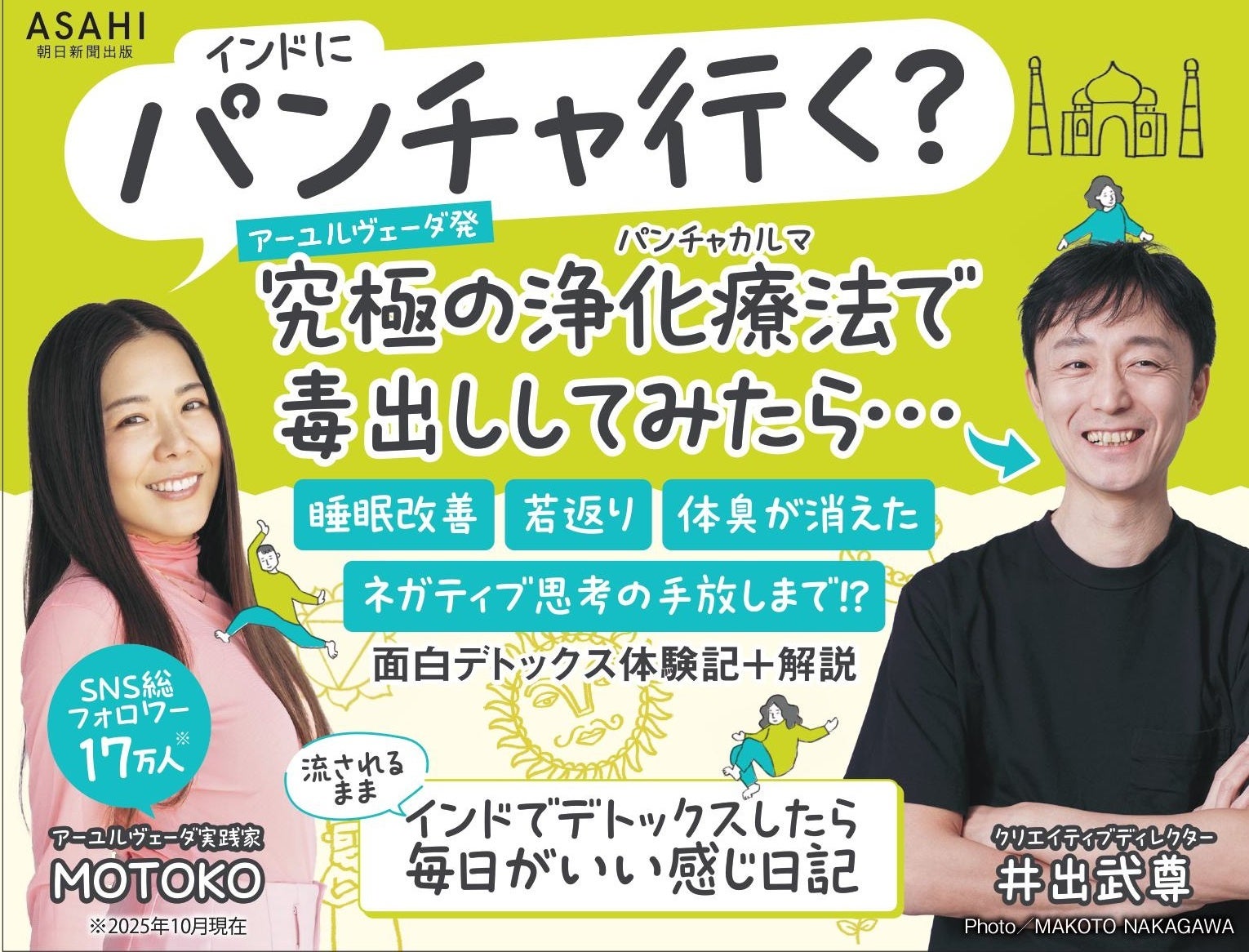 『流されるままインドでデトックスしたら毎日がいい感じ日記』は、全身オイルまみれの浄化療法を通じて、「ふつうのおじさん」こと井出武尊さんが、自分の心と身体に向き合う14日間をつづった体験記と、SNS総フォロワー17万人超の人気アーユルヴェーダ実践家・MOTOKOさんの解説の二本立てです。