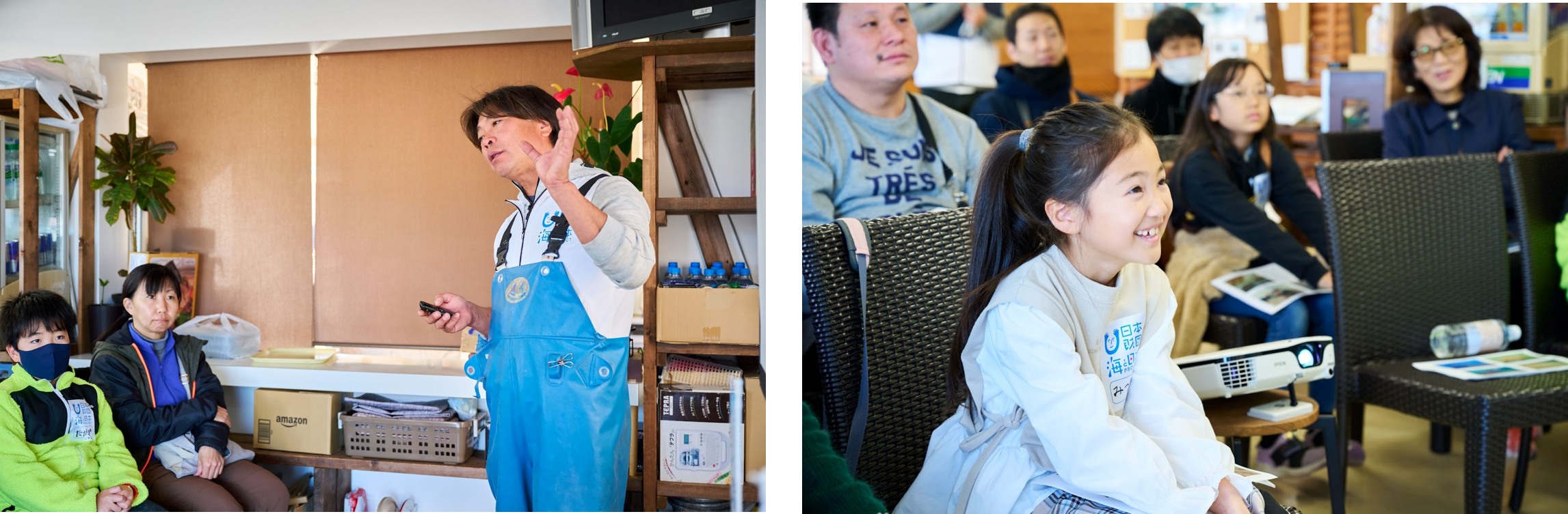 最後に平沢マリンセンターのセンター長 朝倉一哉さんから海についての講義がありました。目の前の海にほぼ毎日潜るという朝倉さん。「今年は本当に海水温が高かった。この海にはサンゴがいるが、石灰化する様子も見られた。沖縄の県魚グルクンが繁殖するようなこともあり、今までにはないことが起こっている。多くの生物による生態系があり、お互いに支えあってバランスのとれた状態が豊かな海だと思う。このように海が変わっていくことが良いことなのか、悪いことなのか、それは皆さんが考え、向き合ってほしい。」と語りかけました。