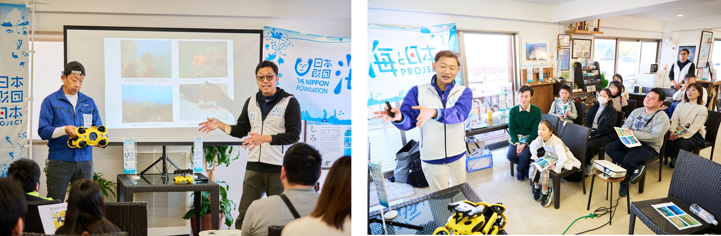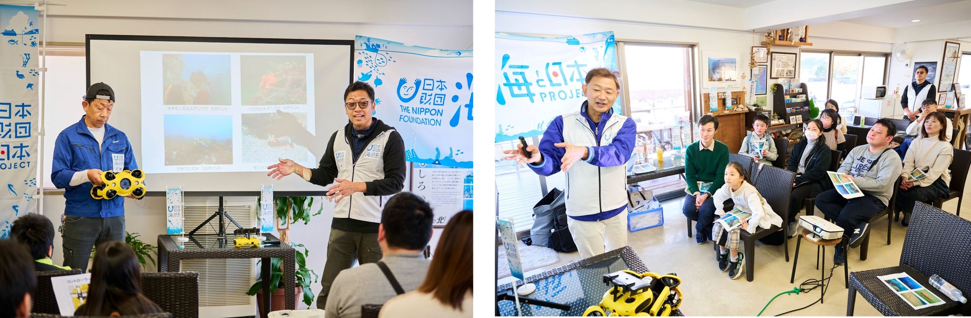 続いて、日本水中ドローン協会認定インストラクターの石田太輔さんがドローンの操作について説明しました。ドローンの基本的な操作法(浮上、沈降)、潜れる深さや機能などについて説明する石田さん。「空を飛ぶドローンと違ってメンテナンスが大変です。海に入れるときは、使用後に陸でしっかりと塩を洗い流さないと壊れてしまう。最近は海のごみも問題です。釣り糸などが絡まって故障してしまったこともあります。塩やごみ、砂など海ならではの環境と向き合わなくてはいけません。」と話していました。