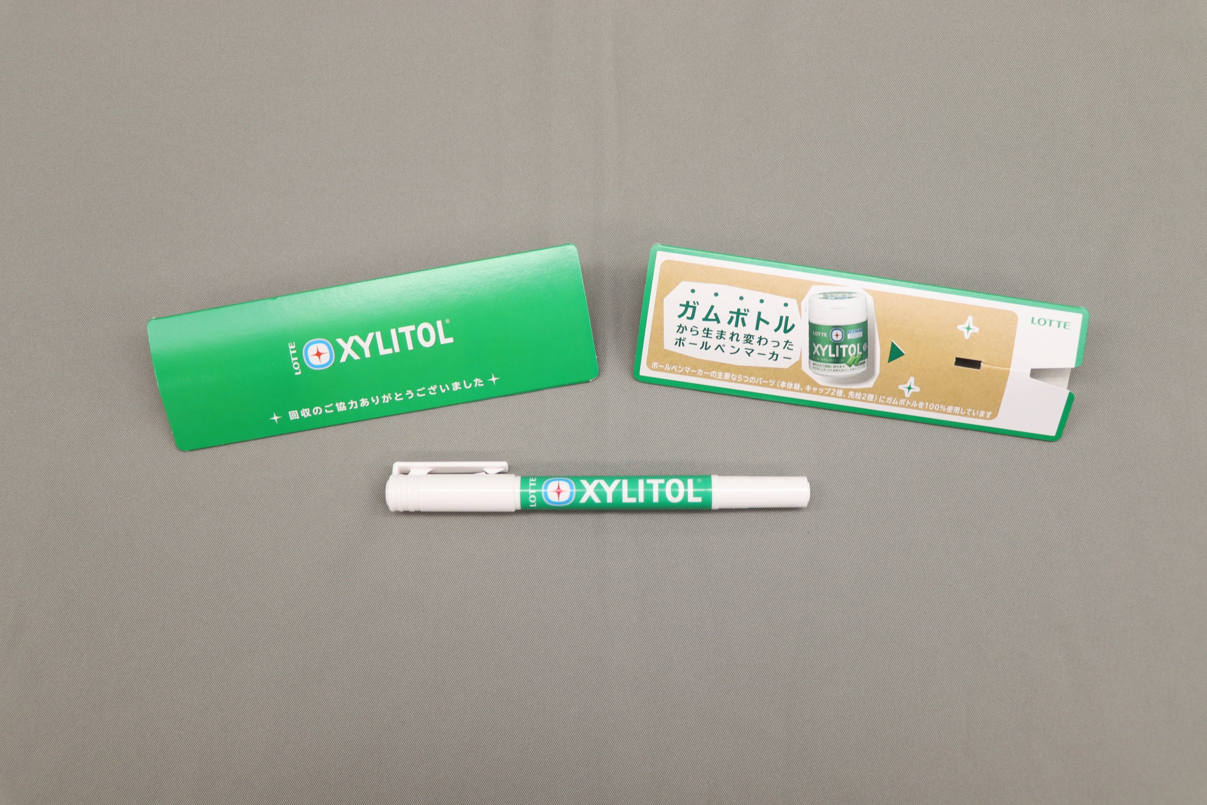 本実証実験は、喫食後に不要となったガムボトル容器を回収し、ボールペンにリサイクルする取り組みです。回収に協力いただける団体・企業様の事業所に「ガムボトル回収ボックス」を設置し、回収された容器はリサイクルペレットに成形された後、ボールペンに生まれ変わりました。