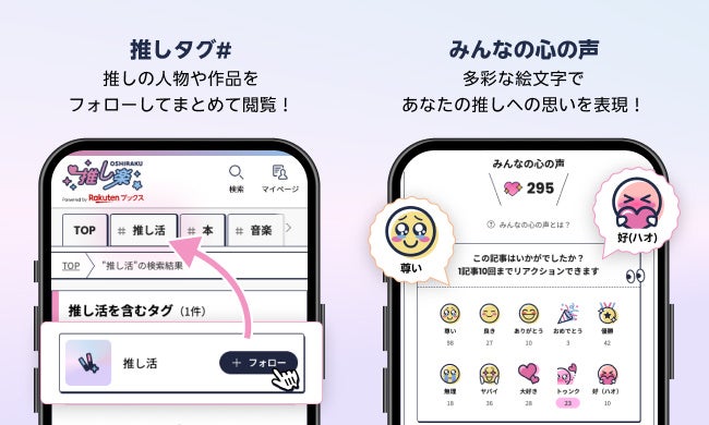 「推し楽」は、「推し活するあなたを“推す”メディア」として音楽から本、アニメ、映画、ドラマまで幅広いジャンルの最新ニュースや話題のコンテンツに関連したインタビューやコラムを発信します。推し活をする人にとって便利で楽しい機能として、好みの「推し」をフォローして最新情報を逃さない「推しタグ#」機能と、記事にリアクションしてSNSにシェアができる「みんなの心の声」を提供しています。